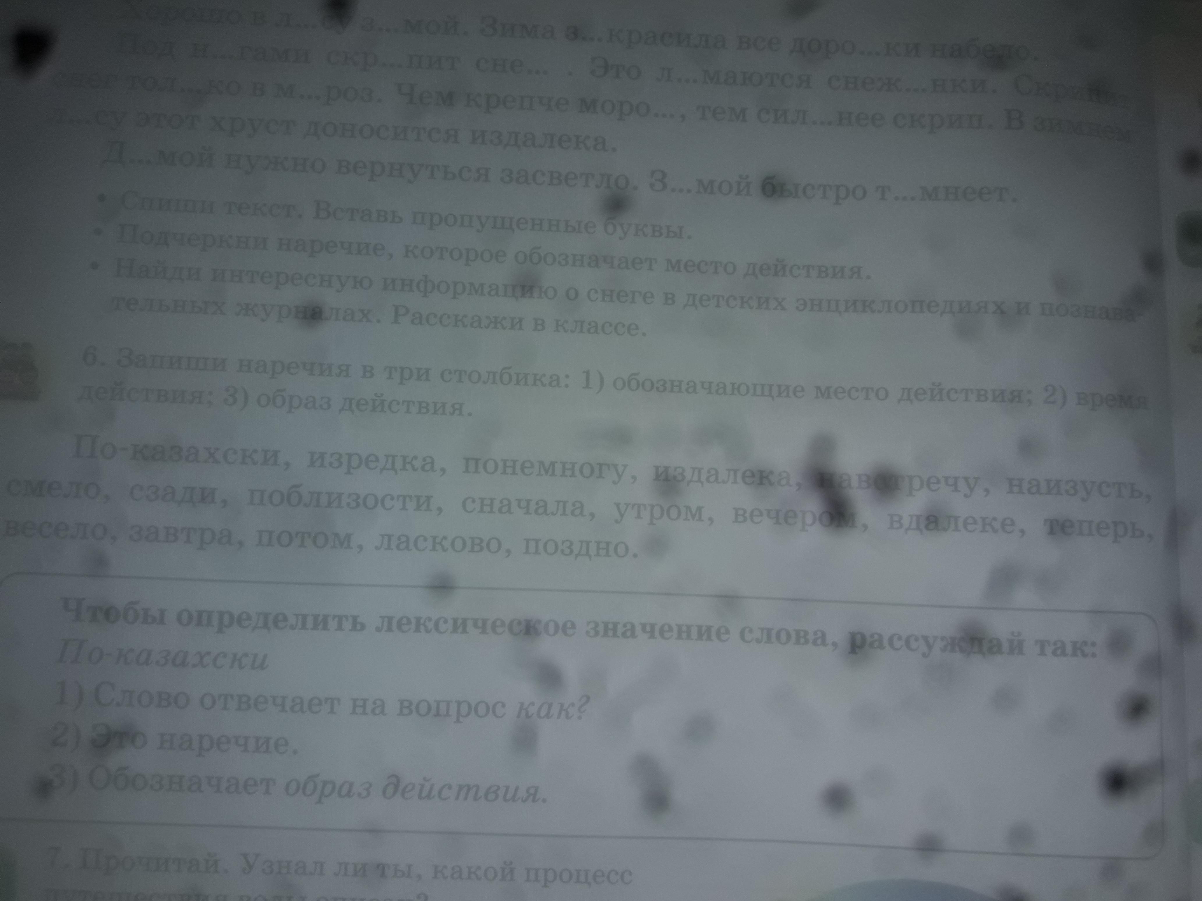 Ответ: 1)издалека, сзади, поблизости, вдалеке 2)изредка, сначала, утром, вечером, теперь, завтра, потом, поздно 3)по-казахски, понемногу, навстречу, наизусть, смело, весело, ласково
