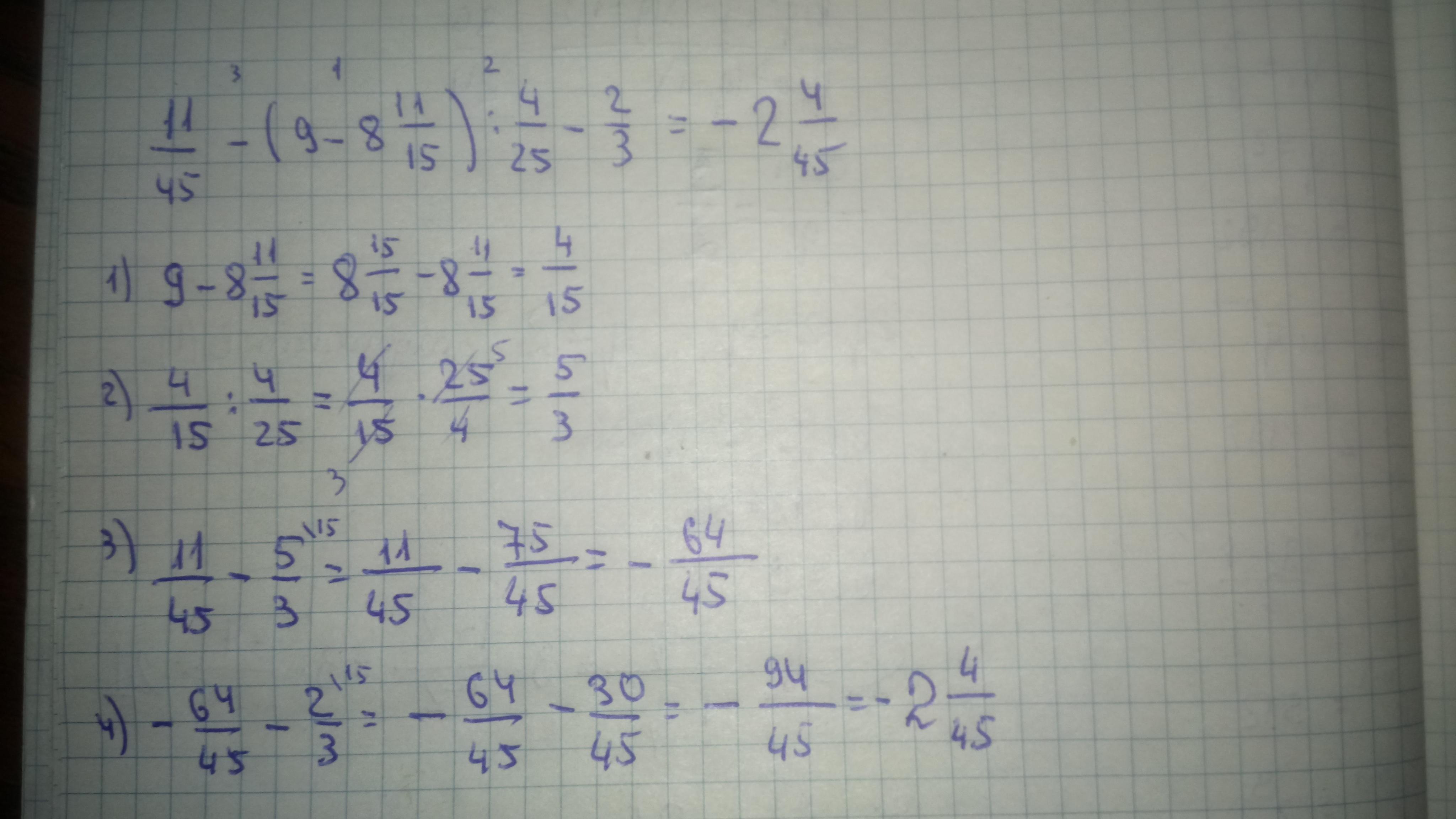 11/45-(9-8/11/15):4/25-2/3 ( помогите пожалуйста ) сейчас объясню дробь 11/ 45 вычитаем минус (9 целых минус 8 целых 11/15 скобка закрывается ) : на 4/25 минус 2/3 . Решите с решением по действиям ответ должен получиться - 2 целых 4/45 пожалуйста ну а заранее всем спасибо.
