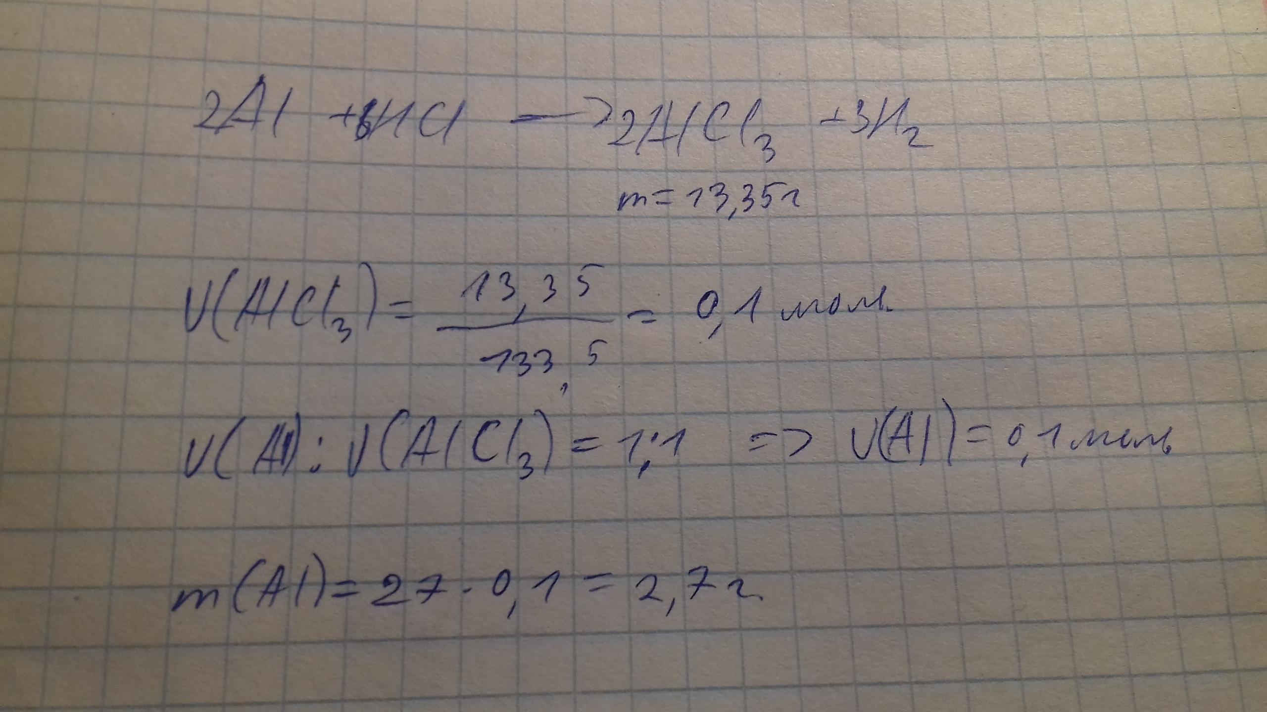 в реакции алюминия с соляной кислотой образовалось 13,35 грамм хлорида алюминия. определите массу и количество алюминия вступившего в реакцию