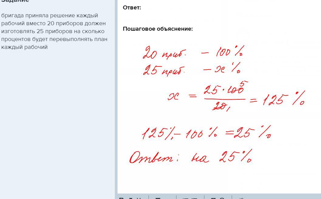 бригада приняла решение каждый рабочий вместо 20 приборов должен изготовлять 25 приборов на сколько процентов будет перевыполнять план каждый рабочий