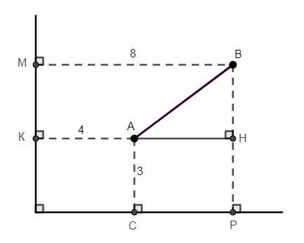.На ділянці, яка обмежена з двох боків взаємно перпендикулярними дорогами, посадили сад. Відстань від яблуні до першої дороги становить 3 м, а до другої — 4 м. Відстань від груші до першої дороги дорівнює 6 м, а до другої — 8 м. Знайти відстань між цими деревами.