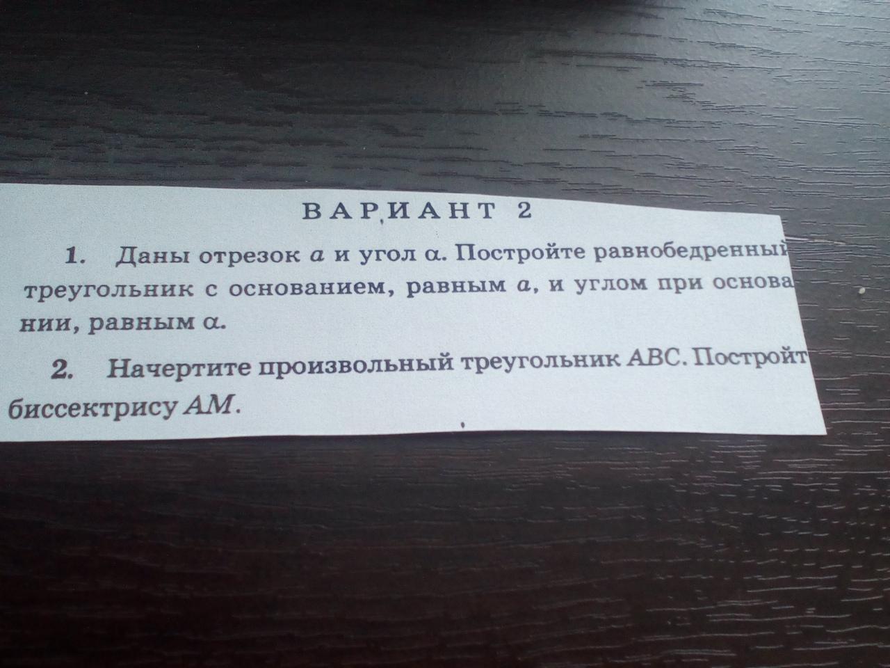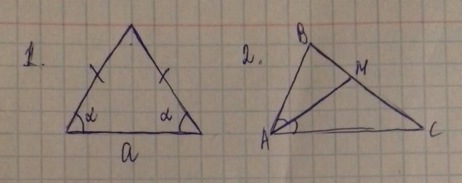 Смотри, в первом нужно начертить такой треугольник, у которого две стороны будут равны(все обозначить точно так же, как и у меня на рисунке). А во втором - построить биссектрису угла А, т.е. поделить прямой АМ угол А пополам(и обозначить, как я обозначила).
