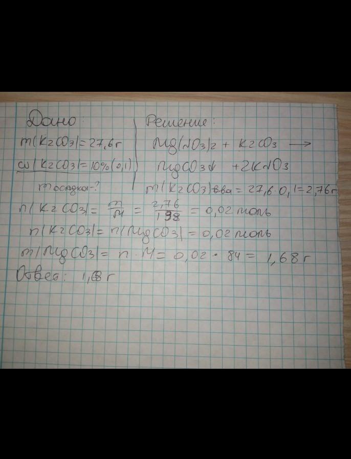 К раствору карбоната калия массой 27,6 г и массовой долей 10 % прилили избыток раствора нитрата магния. Вычислите массу образовавшегося осадка.