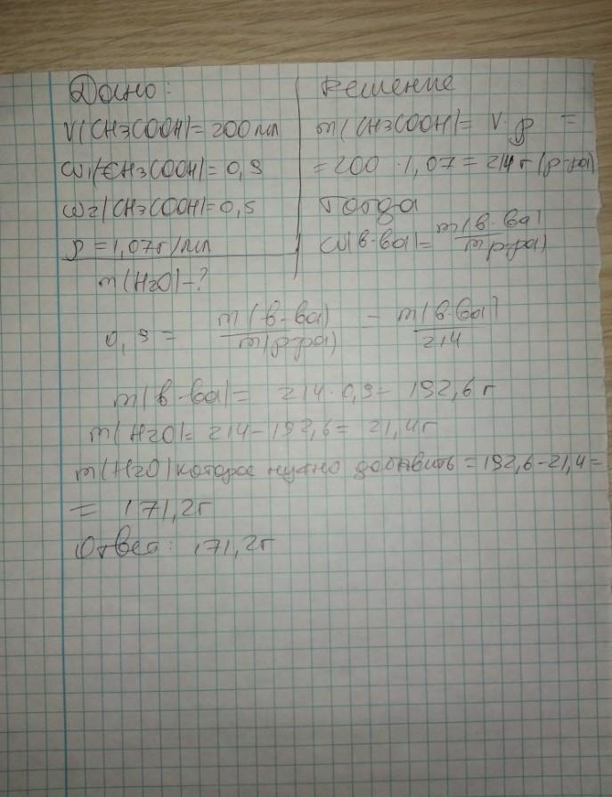 сколько воды нужно добавить к 200 мл роствора уксусной кислоты (w=90%) , чтобы получить новый раствор (w=50%)? Плотность получившегося раствора уксусной кислоты равен 1,07 г/мл.