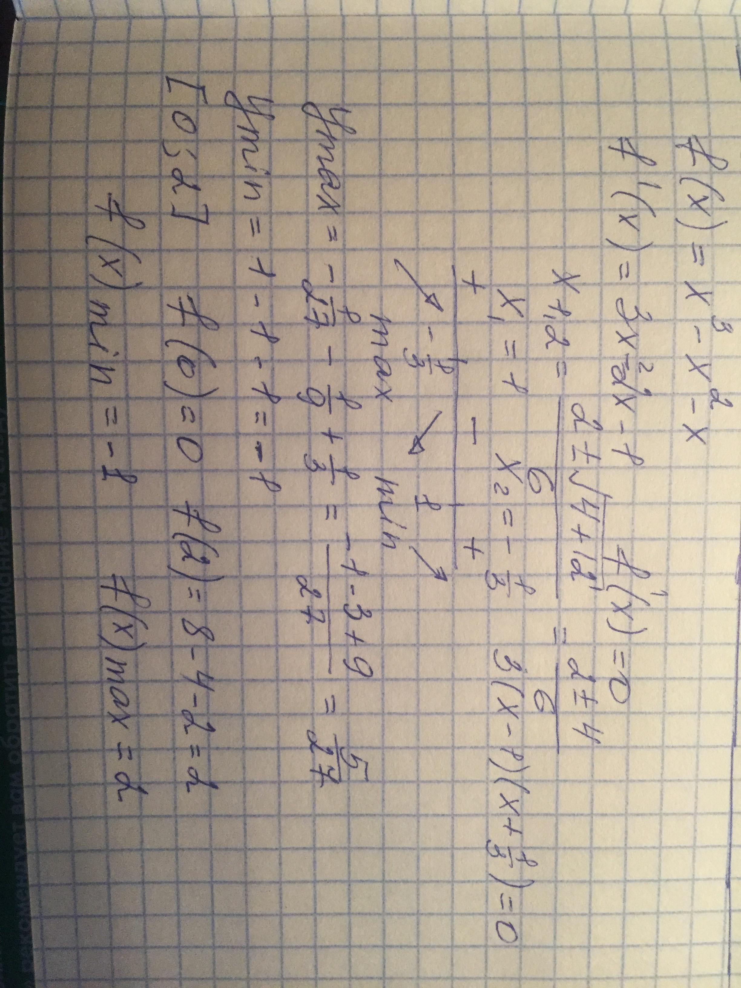 Дана функция f(x)=x^3-x^2-x. Найти промежутки возрастания и убывания функции; экстремумы функции; наибольшее и наименьшее значения функции на промежутке [0;2].