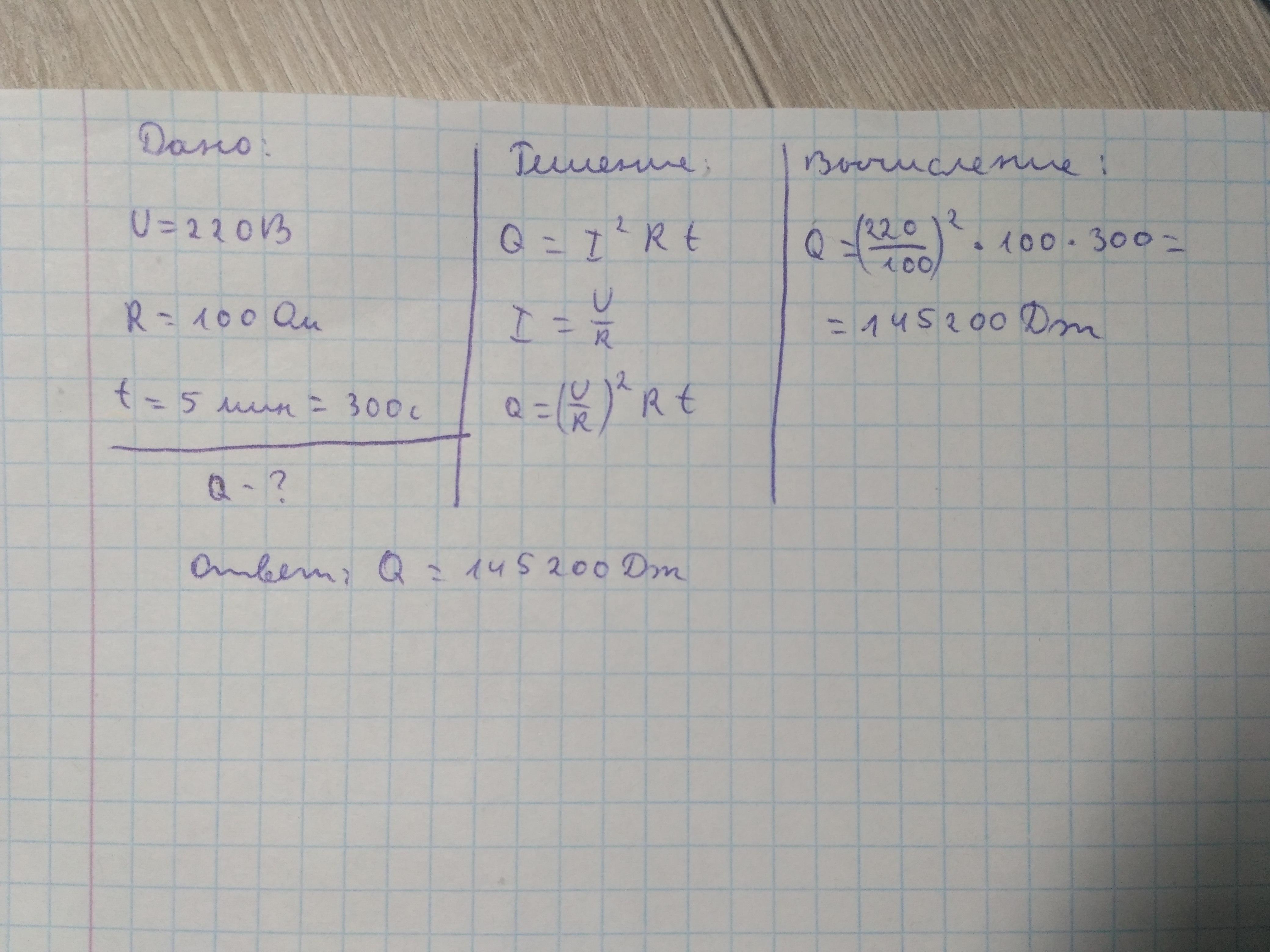 Эл.чайник подключён к эл.сети напряжением 220 в .Сопротивление нагревательного элемента чайника =100.Ом.определите количество теплты потребляемую чайником за 5 мин