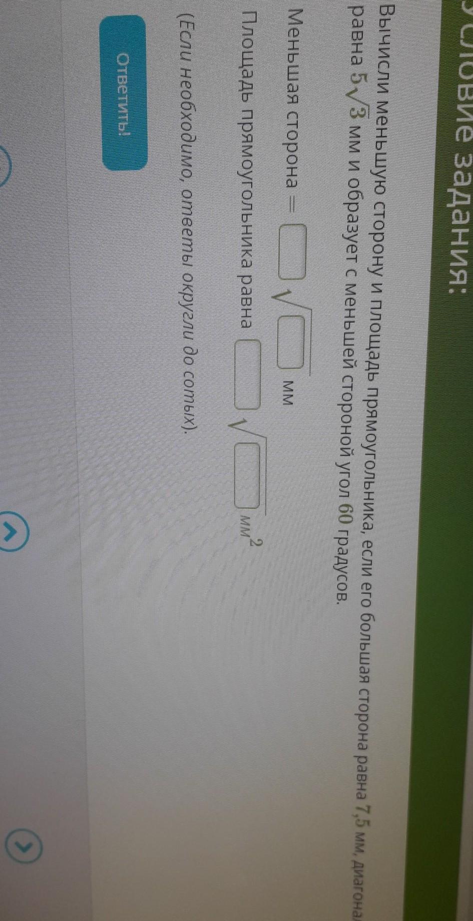 площадь S=ab=7,5*5(√3)/2=18,75√3