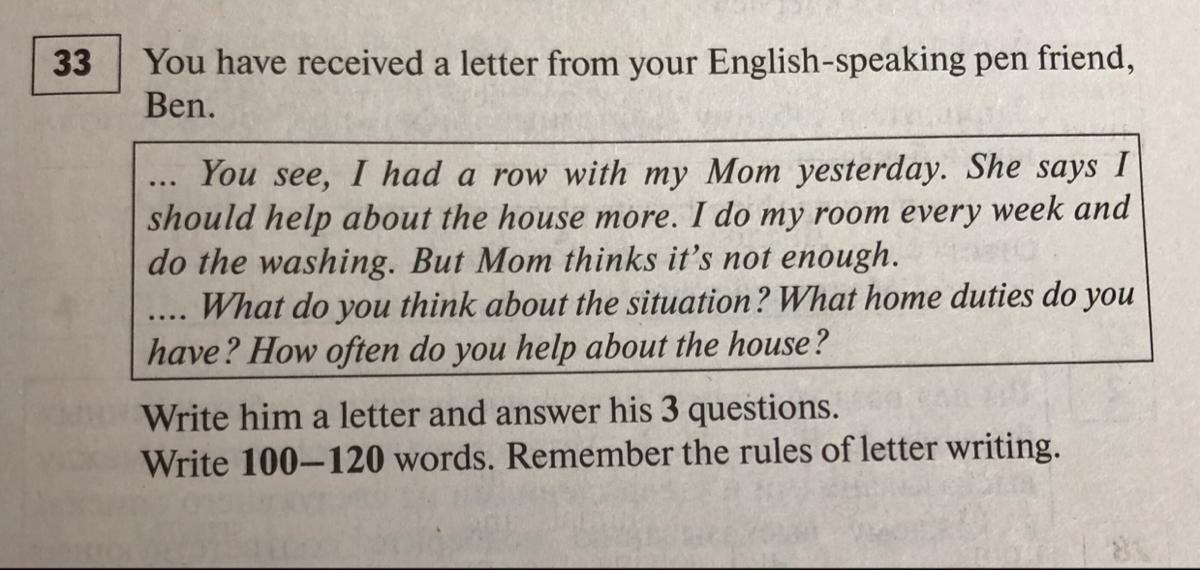 Hi! Thank you for your letter. I can say that everyone in my family has some home duties. As for me, I also do my room every day, dust the furniture twice a week and usually water the flowers. However, my mom does much in good keeping the house. If she asks me to do something extra, I try to help her, for example, I can go shopping or take out rubbish. When I am busy I can`t help. She knows and understands my attitude so that we don`t have a row. I think you also should help your mom when you aren`t busy.