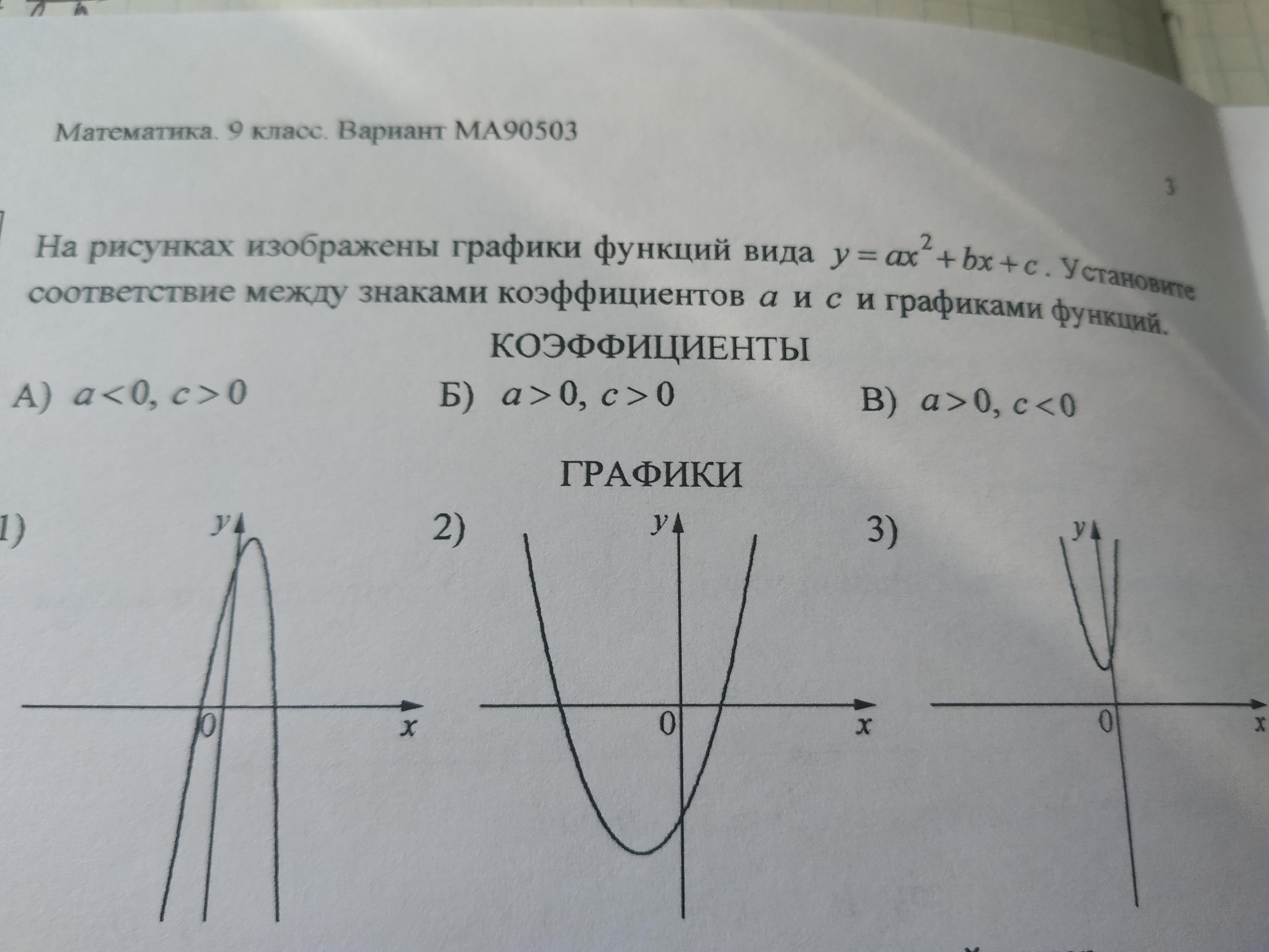 1) a>0 – ветви направлены вверх; c>0 – положительное смещение по Oy при x=0. Этим условиям соответствует график под буквой Г.