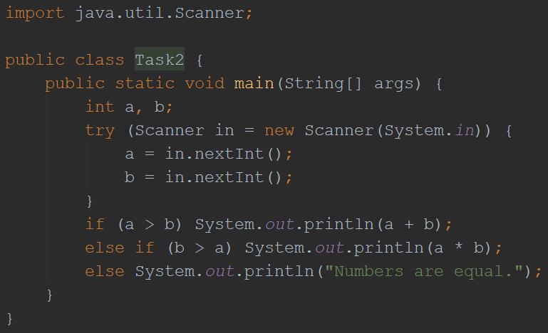 2. Напишите класс, который принимает с клавиатуры два целых числа и, если первое больше второго, выводит на экран их сумму, если же наоборот – выводит на экран их произведение. В случае же, если числа одинаковы, программа выводит на экран сообщение Числа равны.