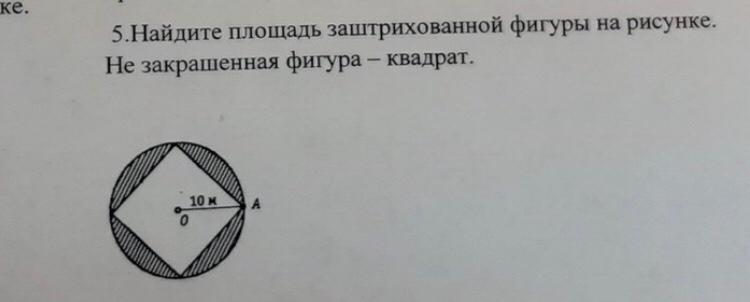 Узнаем площадь заштрихованной фигуры, для этого от площади круга отнимем площадь квадрата