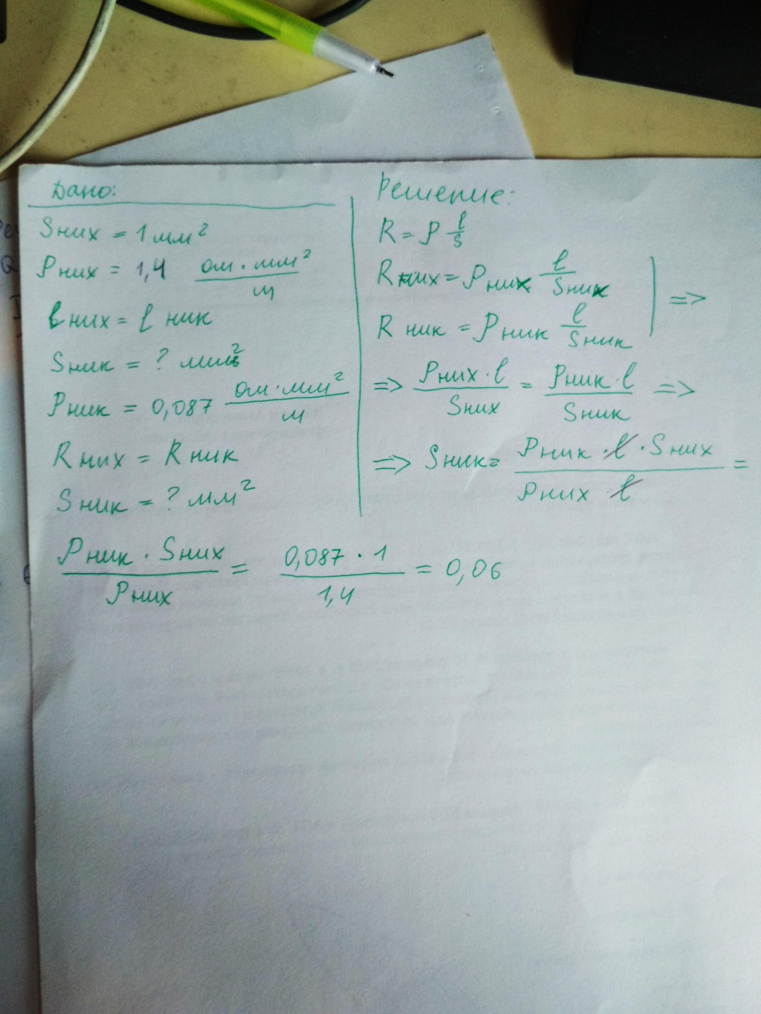 В электронагревателе нихромовую проволоку площадью поперечного сечения 1 мм2 заменяют никелиновой проволокой такой же длины. Какой должна быть площадь поперечного сечения никелиновой проволоки, чтобы сопротивление нагревателя осталось прежним?