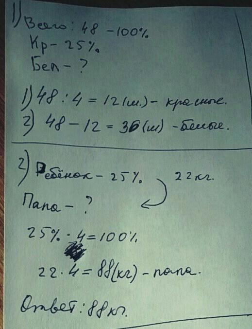 Масса ребенка составляет 25% массы папы. Какова масса папы, если масса ребенка 22 кг? Ответ: кг
