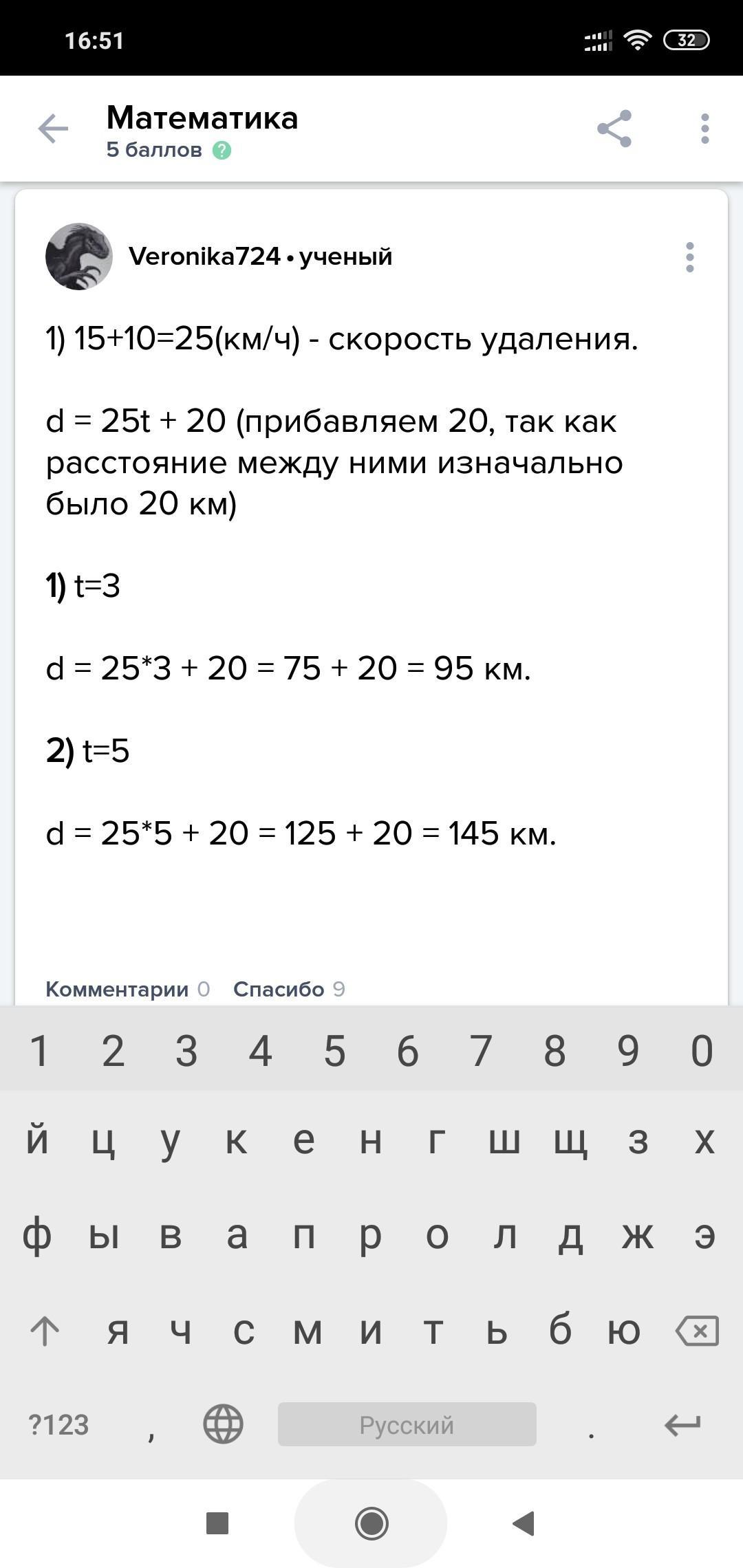 Из двух сёл,находящихся на расстоянии 20 км друг от друга,выехали одновременно в противоположных направлениях два велосипедиста.Один из них ехал с скоростью 15 км/ч,а другой -10 км/ч.На каком расстоянии (d) друг от друга будут велосипедисты через t часов? Запишите формулу,устанавливающую зависимость расстояния между велосипедистами (d) от времени (t) в случае движения в противоположных направлениях.Пользуясь этой формулой,найдите:d,если t=3 d если t=5