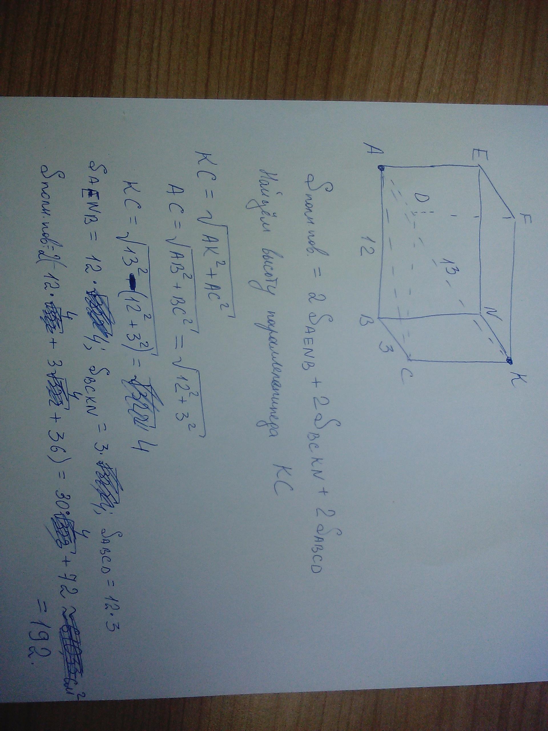 Вычислите площадь полной поверхности прямоугольного параллелепипеда , длины сторон основания которого 12 см и 3 см , а диагональ 13 см .