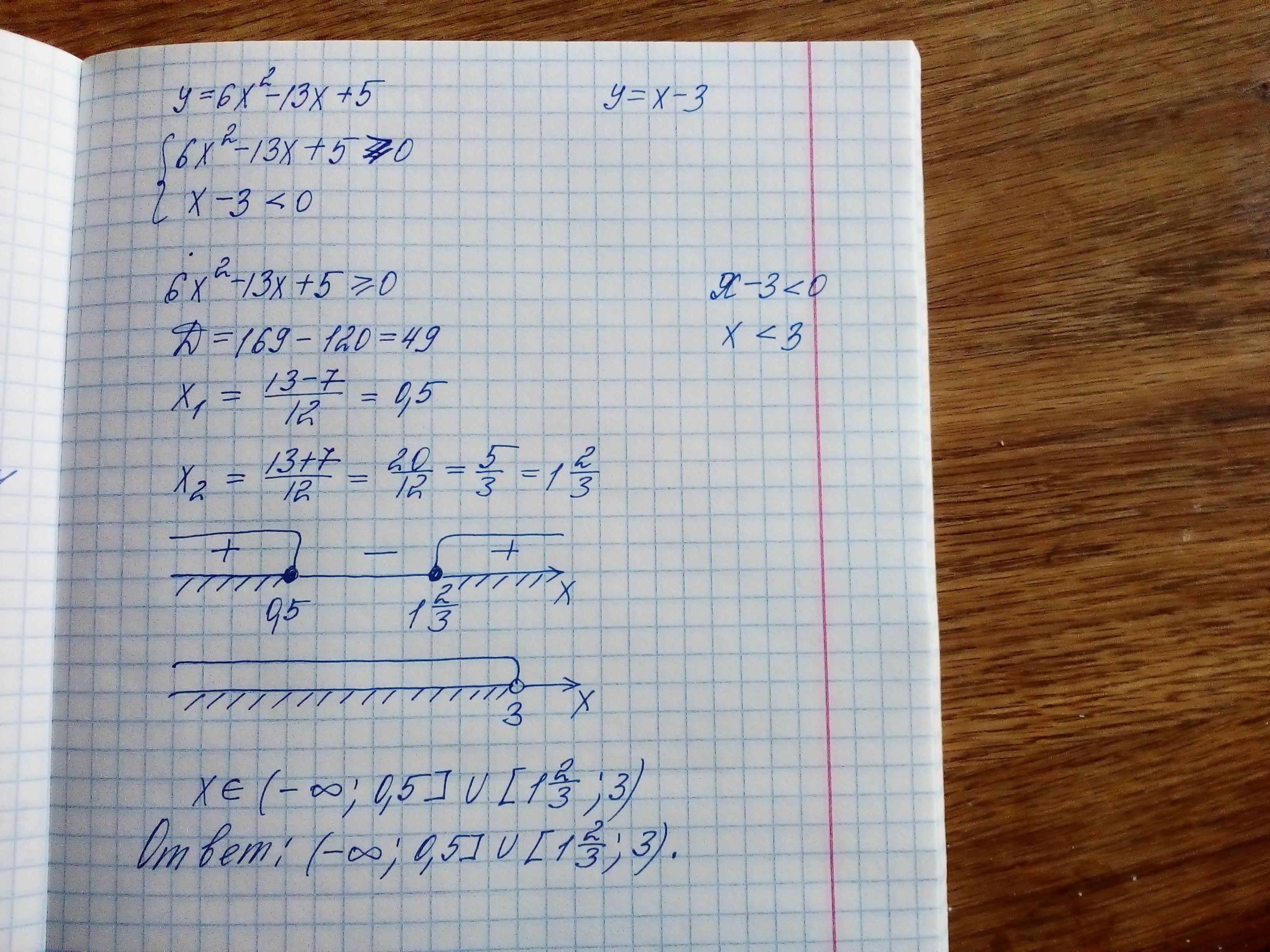 найдите все значения аргумента, при которых функция y=6x²-13x+5 принимает неотрицатильные значенрия а функция y=x-3 принимает отрицатильные значения