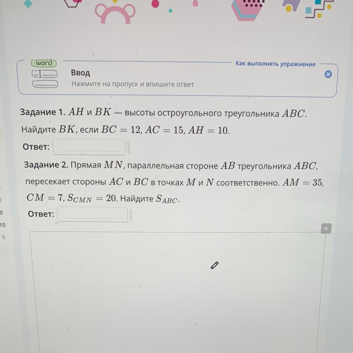 1) площадь = 1/2 АН*ВС = 1/2 ВК*АС