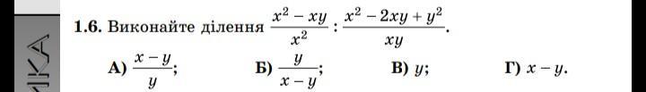 frac{x^2-xy}{x^2}:frac{x^2-2xy+y^2}{xy}=frac{x, (x-y)}{x^2}:frac{(x-y)^2}{xy}=frac{x, (x-y)}{x^2}cdot frac{xy}{(x-y)^2}=frac{y}{x-y}