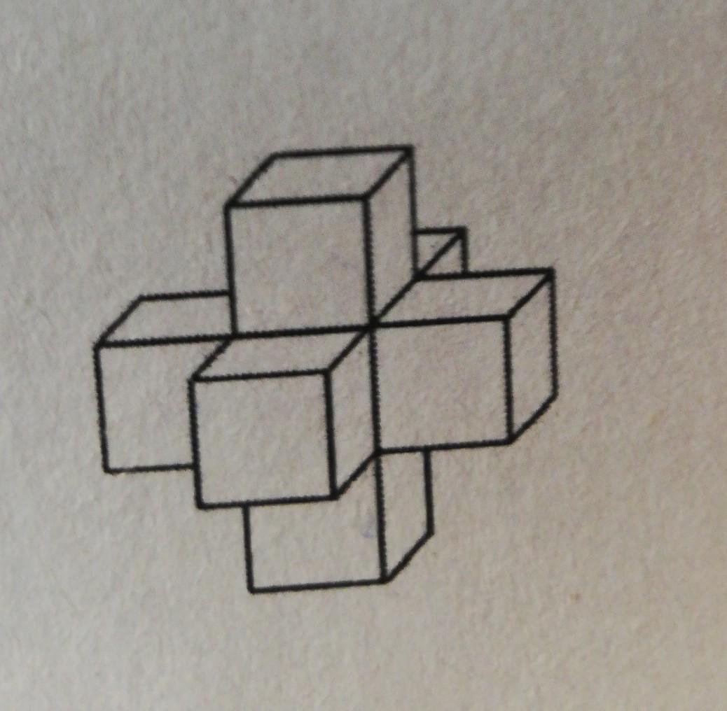 Дима склеил из кубиков объёмный крест (см. рисунок). Сколько кубиков потребовалось Диме для этой конструкции?Сколько краски потребуется на покраску поверхности данного креста, если для склейки кубиков потребовалось 30 г клея? Расход клея и краски на одну и ту же площадь поверхности одинаков. При склеивании кубиков обрабатывается клеем лишь одно из склеиваемых поверхностей