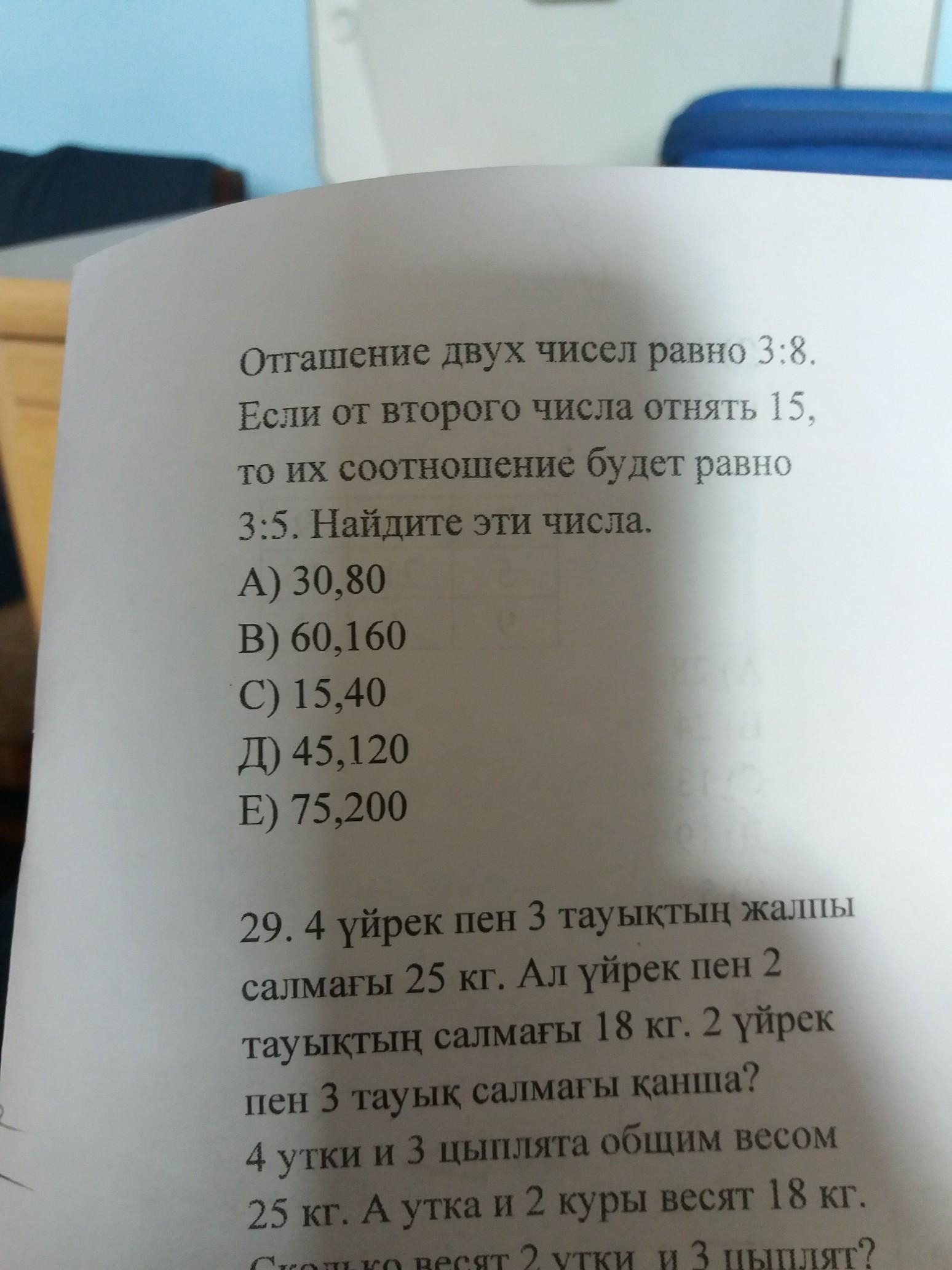 отношение двух чисел равно 3:8.Если от второго числа отнять 15,то их соотношение будет равно 3:5.Найидите числа