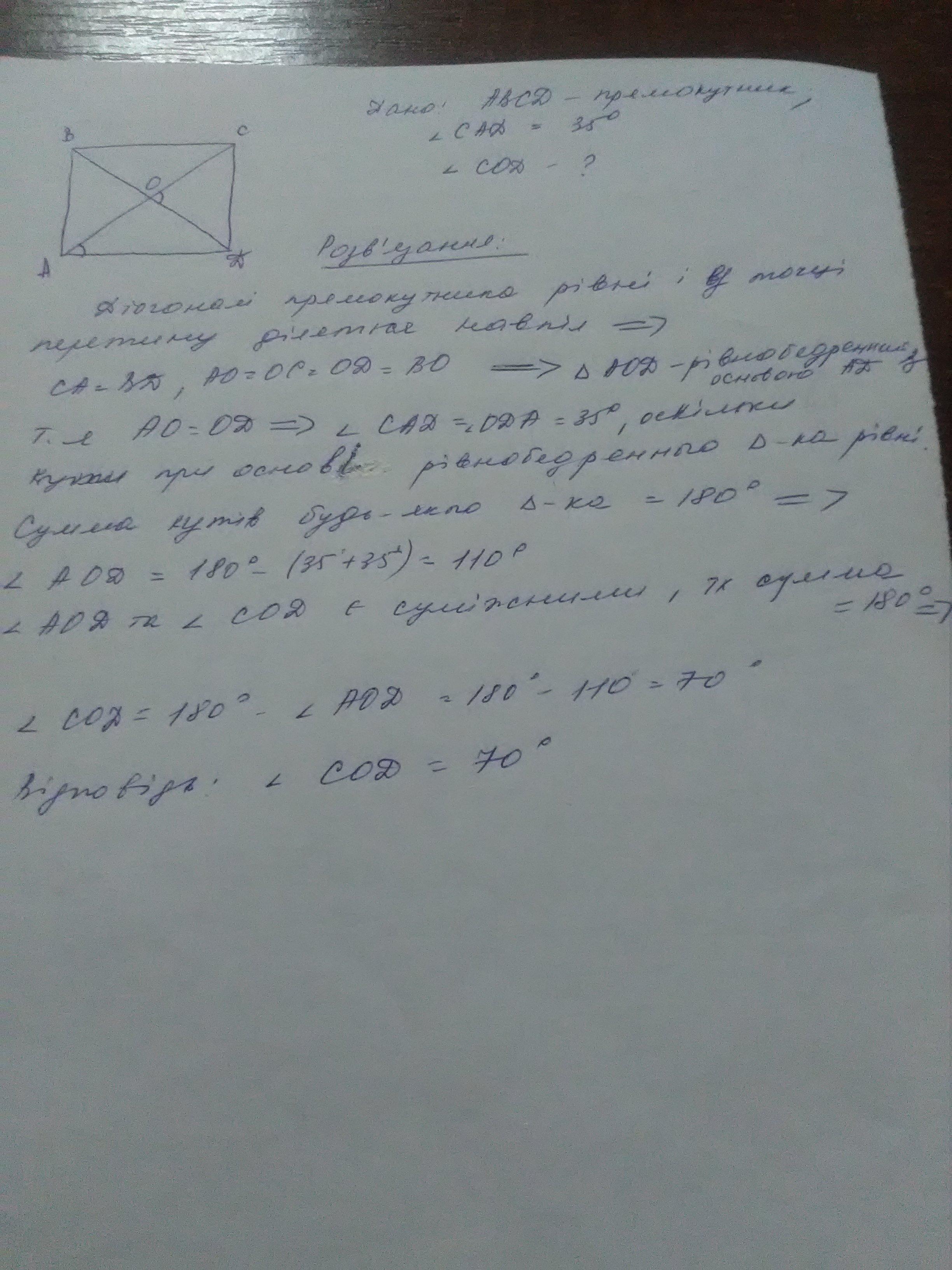 На рисунку зображено прямокутник ABCD, ∠CAD=35°. Визначте градусну мiру ∠COD. (BD и АС -диагонали, О- точка пересечения диагоналей). Варианты ответов: А)35°; Б)55°; В)65°; Г)70°; Д)145°;