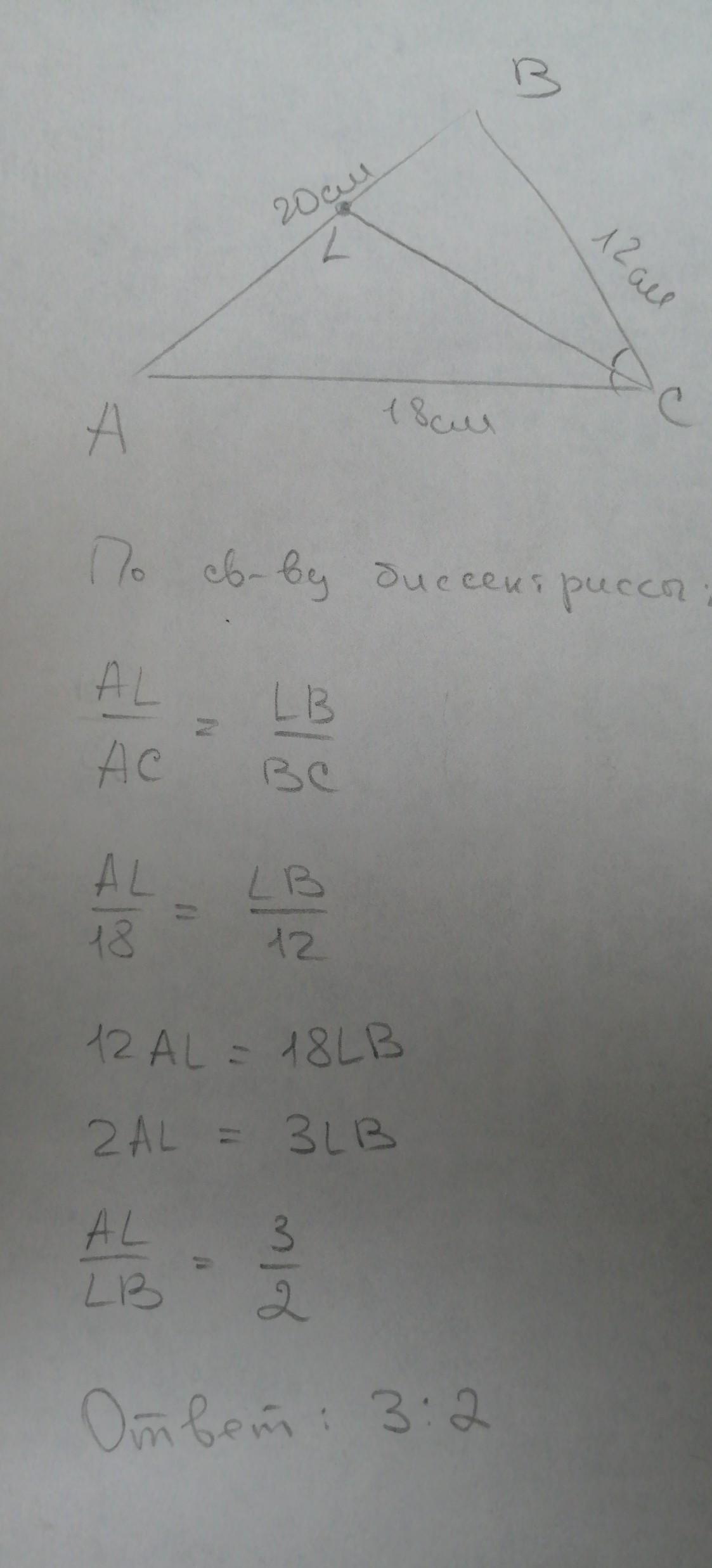 В треугольнике ABC, AB=20см, BC=12см, AC=18см. Найдите длины отрезков, на которые делится сторона AB биссектрисой, проведённой из вершины C.