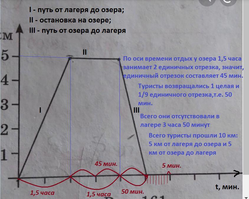 на рисунке 161 изображена движения туристов Используя рисунок 161 Ответьте на следующие вопросы Сколько километров туристы прошли до озера