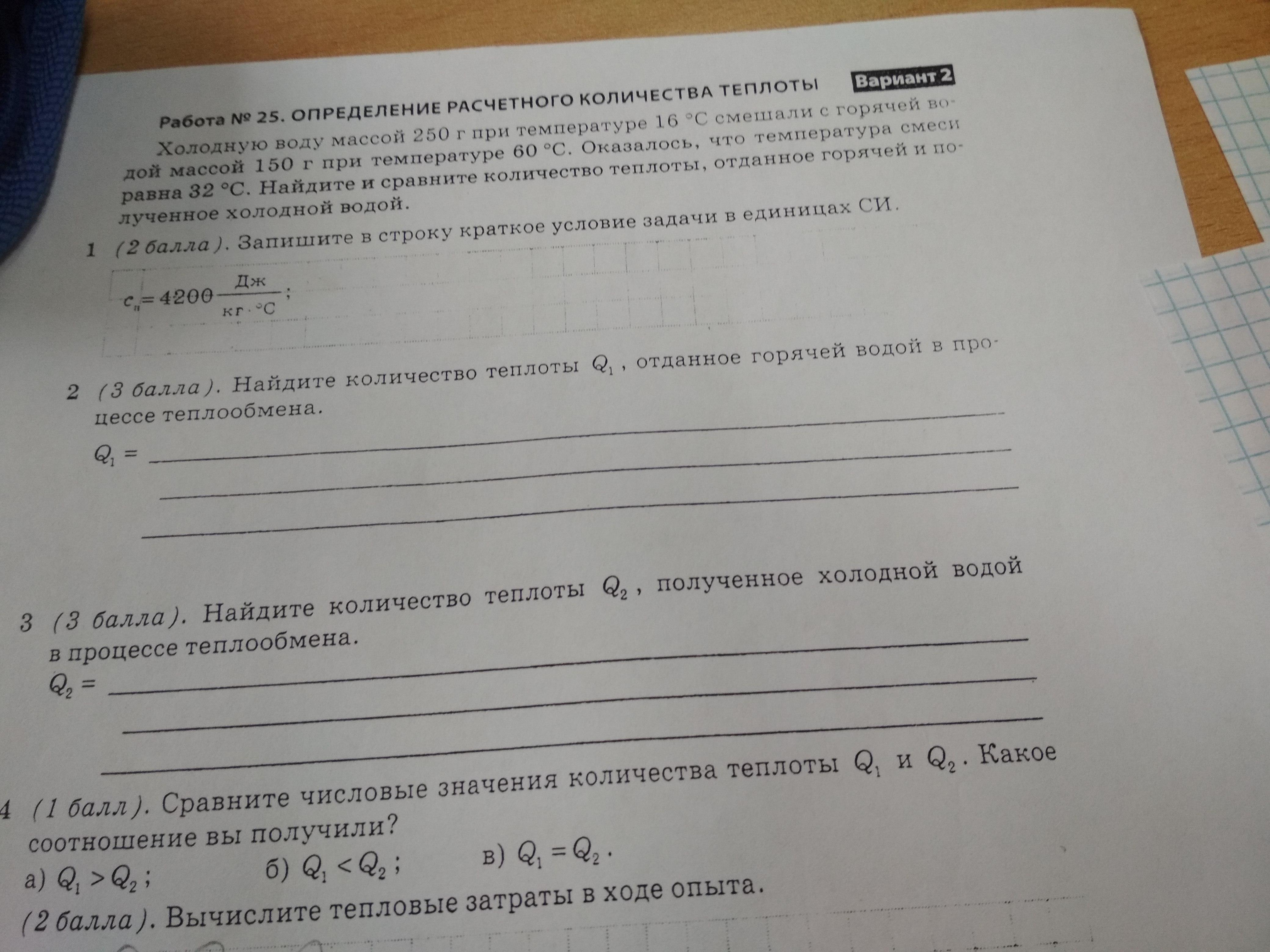 3. Q2=c*m1*(T-t1)=4200*0,25*16=16800 Дж=16,8 кДж.