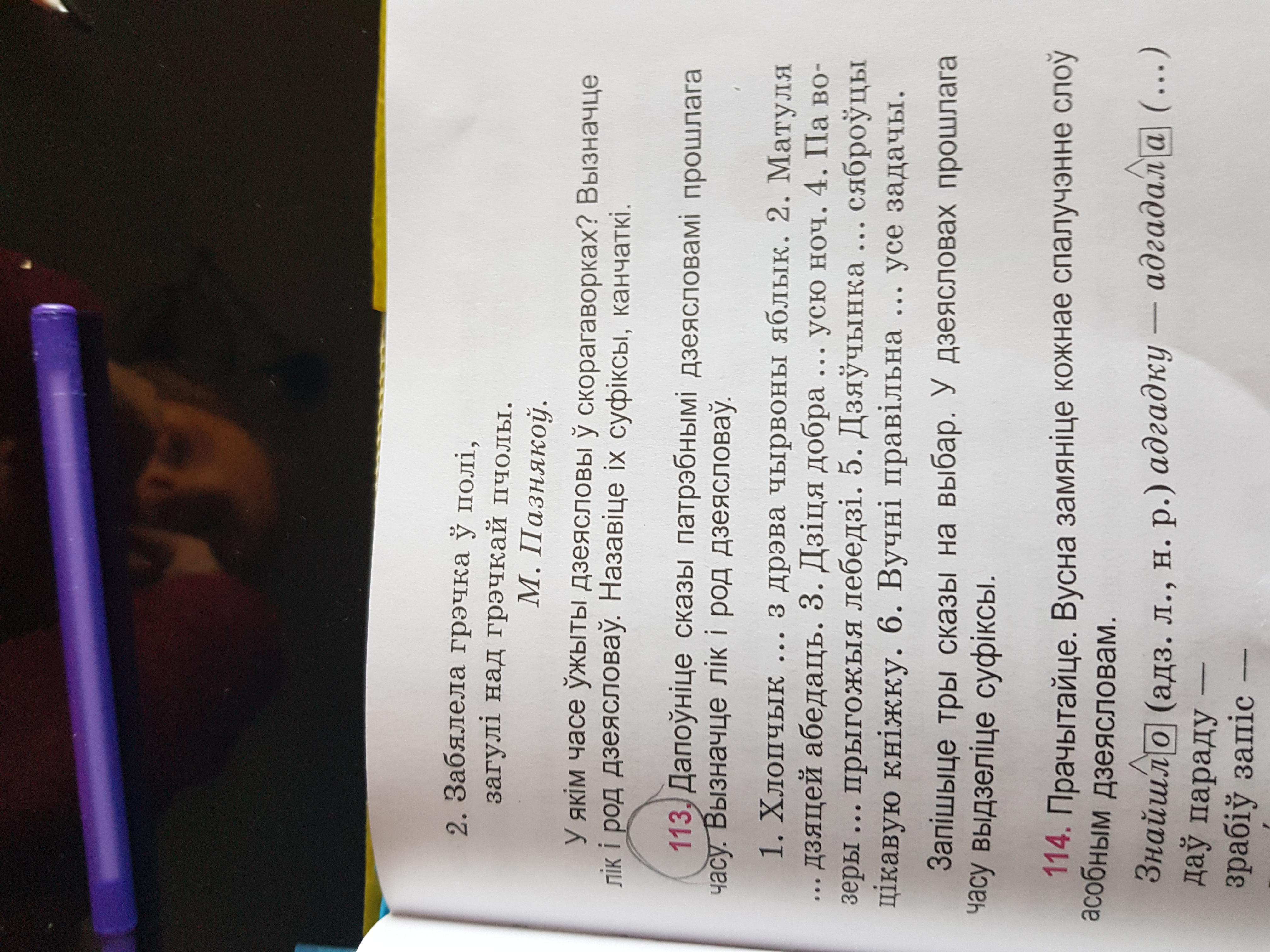 Практыкаванне 113 .Дапоунице сказы патрэбными дзеясловами прошлага часу.Вызначыце лик и род дзеясловау. Хлопчык.....з дрэва чырвоны яблык.Матуля ......дзяцей абедаць.Дзиця добра ....усю ноч.Па возеры ... прыгожыя лебедзи.Дзяучынка...сяброуцы цикавую книжку .Вучни правильна....усе задачы .