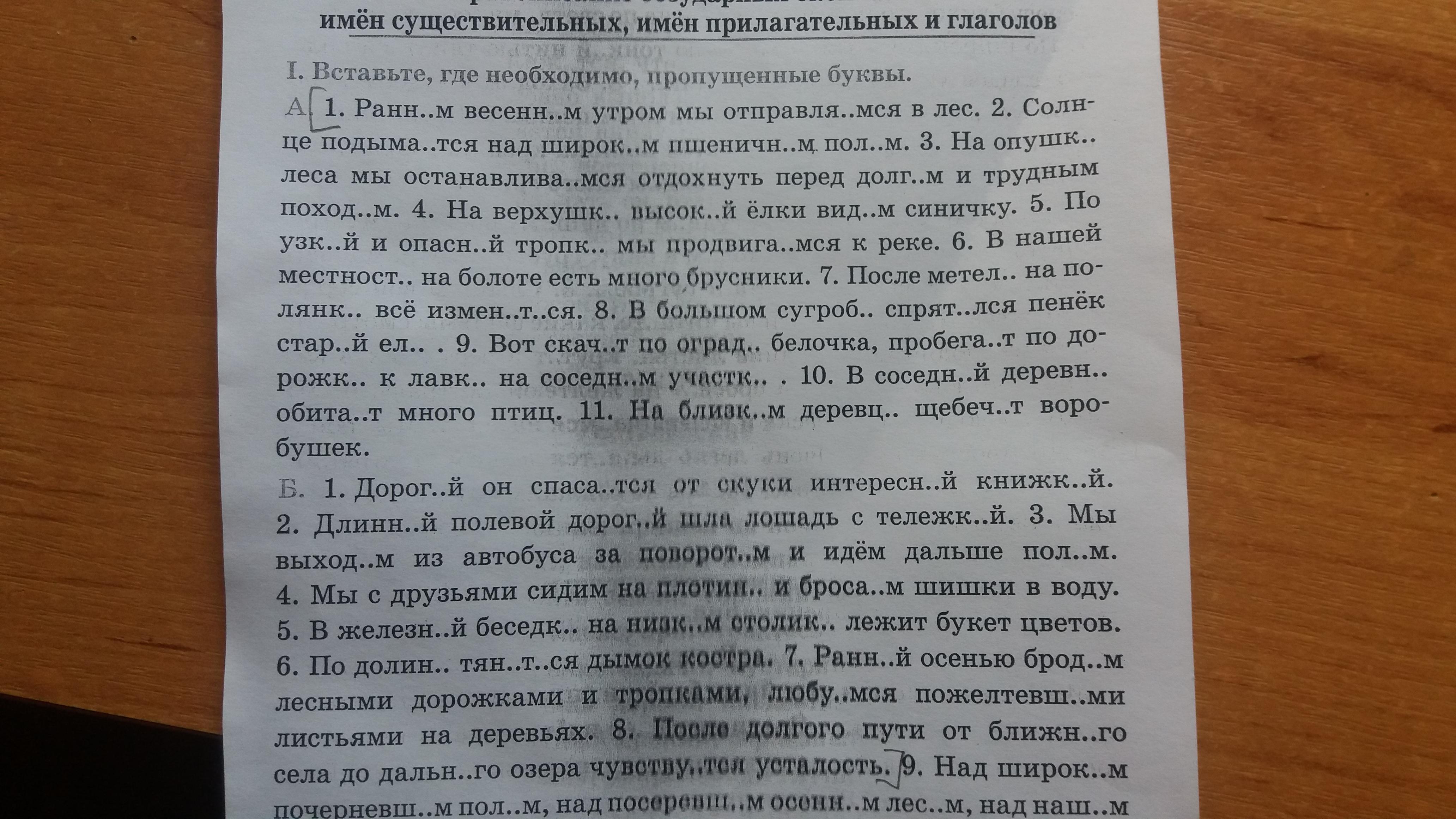 А 1. Ранним весенним утром мы отправляемся в лес. 2. Солнце подымается над широким пшеничным полем. 3. На опушке леса мы останавливаемся отдохнуть перед долгим и трудным походом. 4. На верхушке высокой ёлки видим синичку. 5. По узкой и опасной тропинки мы продвигаемся к реке. 6. В нашей местности на болоте есть много брусники. 7. После метели на полянке всё изменится. 8. В большом сугробе спрятался пенёк старой ели. 9. Вот скачет по ограде белочка, пробегает по дорожке к лавке на соседнем участке. 10. В соседней деревне обитает много птиц. 10. На близком деревце щебечет воробушек.