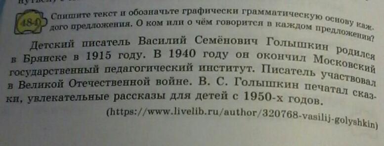 Ответ: Детский писатель Василий Семенович Голышкин родился(сказуемое) в 1915 году. В 1940 году он окончил(сказуемое) Московский государственный педагогический институт. Писатель участвовал( сказуемое) в Великой Отечественной войне. В.С. Голышкин печатал( сказуемое) сказки, увлекательные рассказы для детей с 1950-х годов.