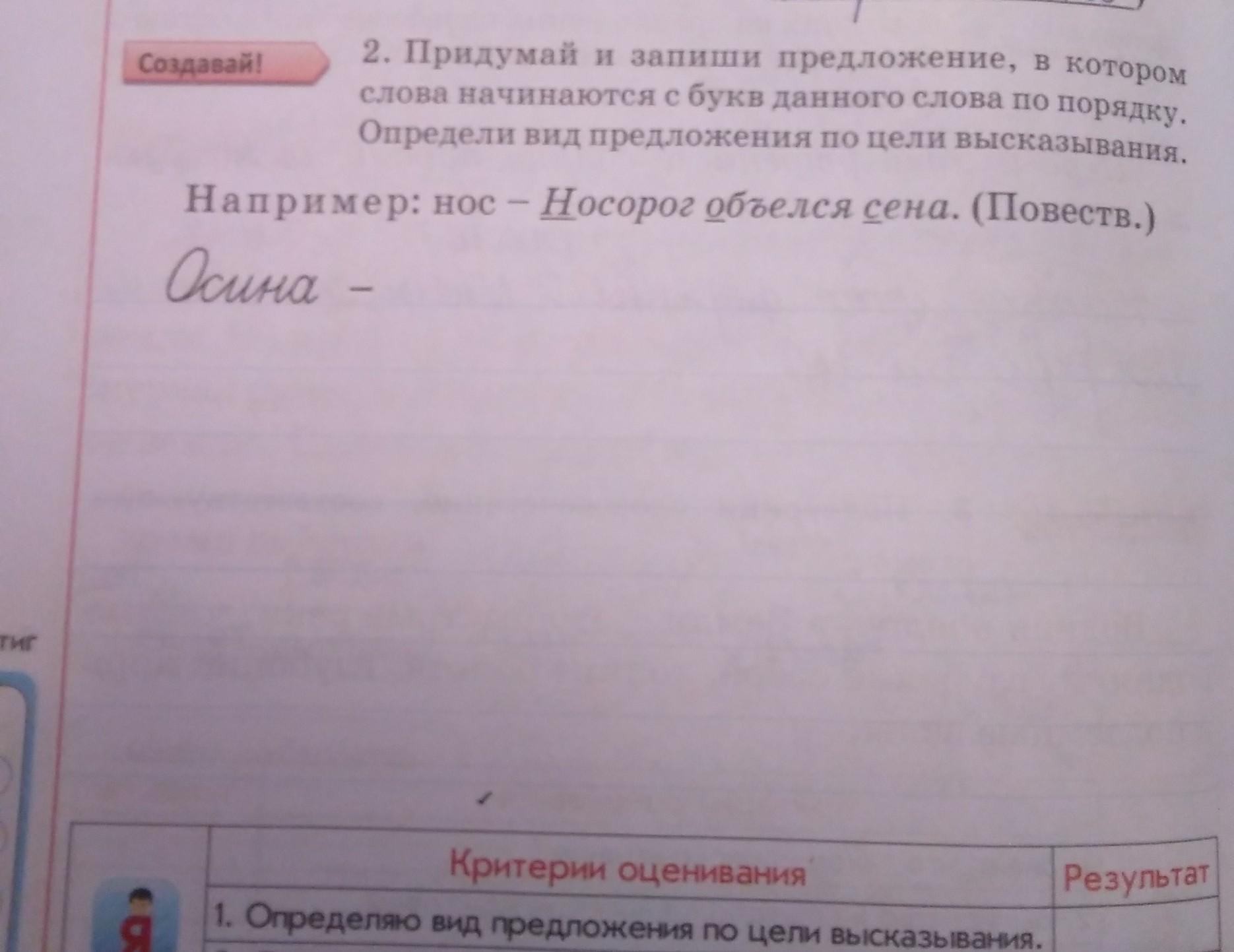 Придумай и запиши предложение в котором ,слова начинаются с букв данного слова по порядку. Определи вид предложения по цели высказывания.