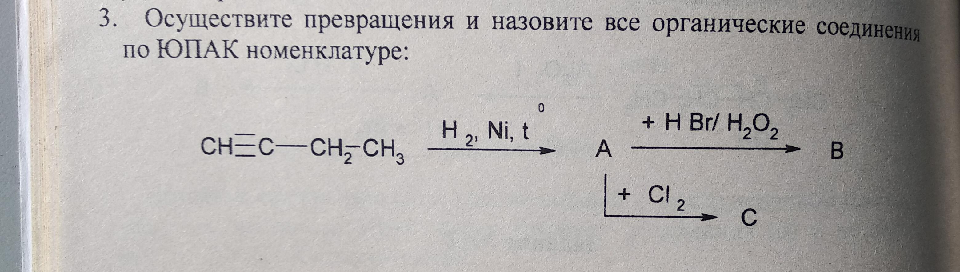 Здарова студент! в этой задаче ошибка, т.к. восстановление алкинов на никелевом катализаторе, в отличии от отравленных таких как катализатор линдлара, приводит к их полному восстановлению до алканов, а следующая реакция в цепи ( имею ввиду HBr /H2O2)уже никак не пойдет. а просто хлор без света тоже никак. Поэтому предлагаю следующее: возможно они над первой стрелкой хотели написать какойто отравленный катализатор и сейчас напишу что получится в этом случае