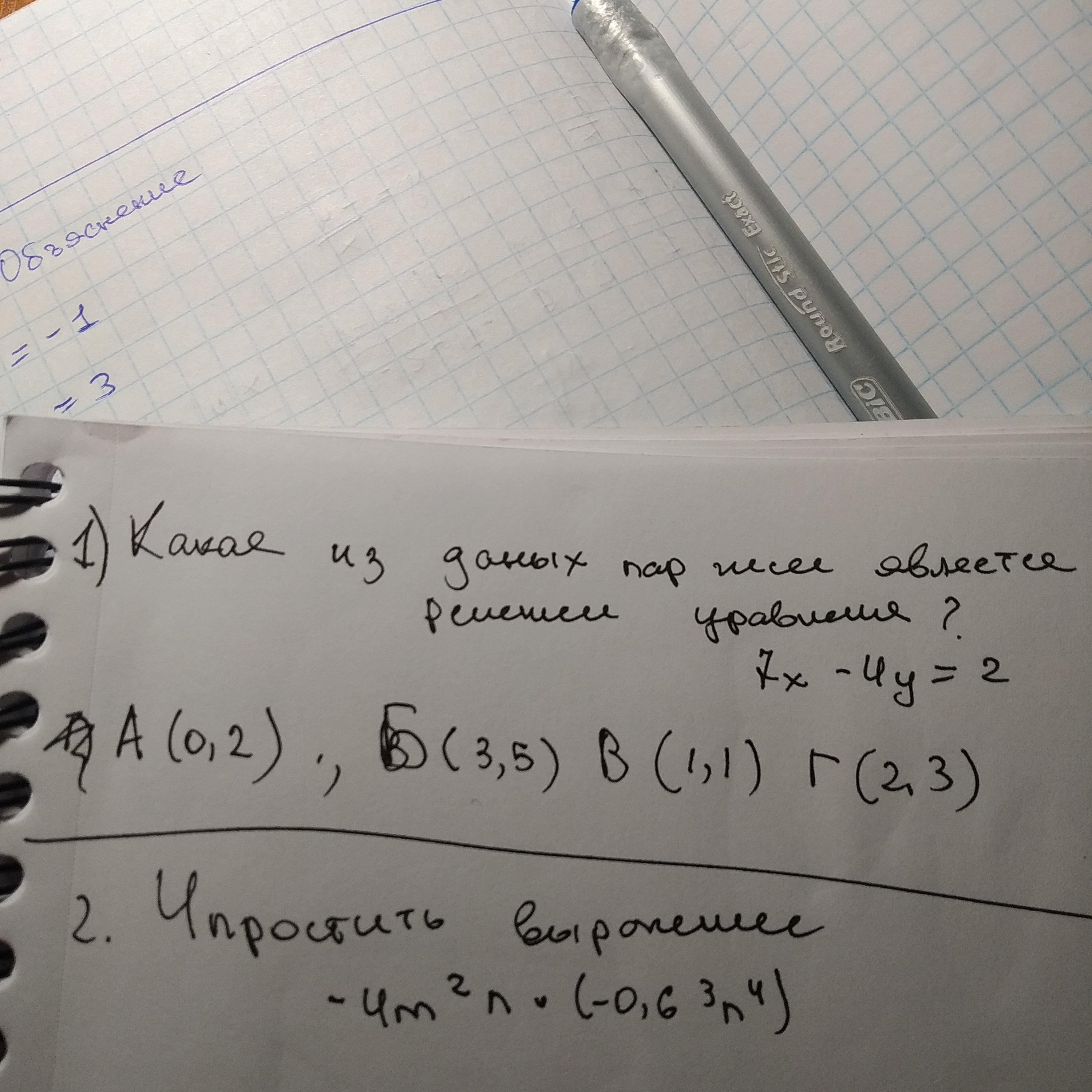 1) У нас есть уравнение 7x - 4y = 2 и пары чисел. Нам нужно найти, какая из них является решением уравнения. Всё, что нам нужно сделать - подставить их значения в уравнение (первое число - x, второе - y) и посмотреть, будет ли соблюдено равенство. Берем первую пару А (0; 2). Подставляем в исходное уравнение: