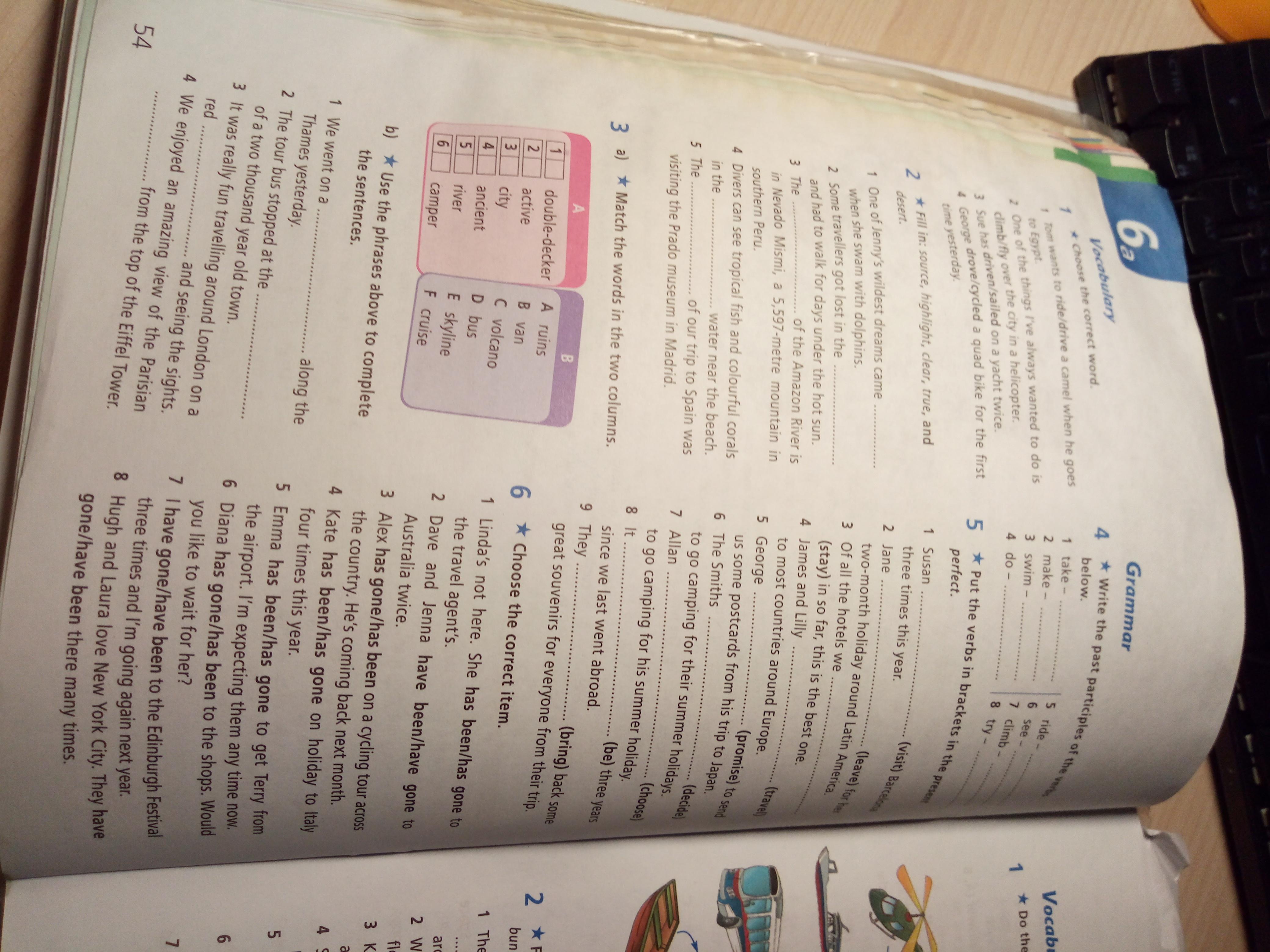 b) 1 river cruise 2 ancient ruins 3 double-decker bus 4 city skyline