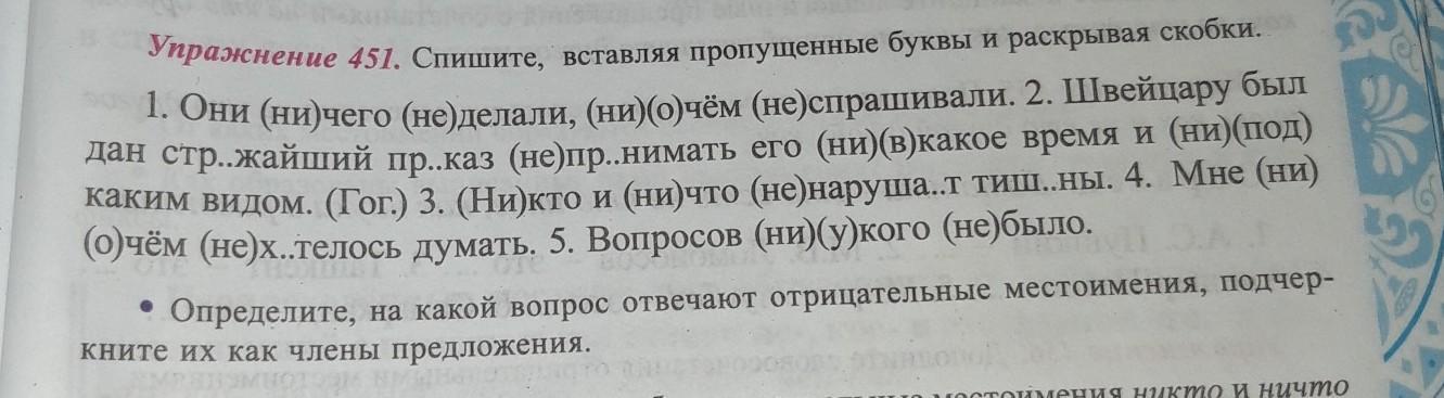 1. они ничего не делали,ни о чём не спрашивали. 2. швейцарубыл дан строжайший приказ не принимать его ни в какое время и ни под каким видом. 3.никто и ничто не нарушает тишины. 4. мне ни о чём не хотелось думать. 5. вопросовни у кого не было