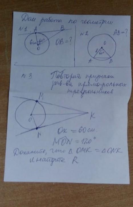 №2: АО и ОВ радиус ⇒ они равны. а если равны то углы при основание тоже равны. Получаем 180-60/2=60°⇒ это равносторонний треугольник.