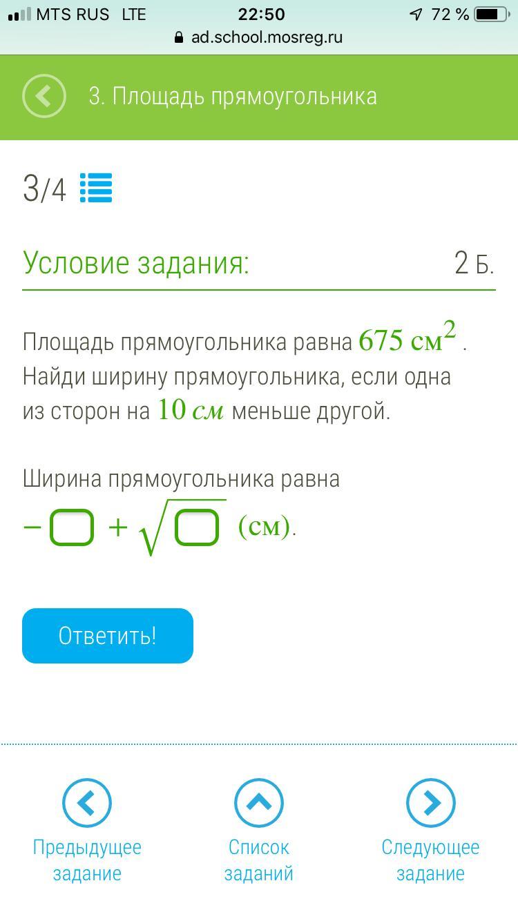 Пояснення: ширина х, длина х+10, S=x(x+10)=675