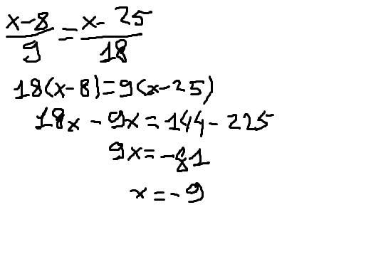 затем переносишь все в левую часть уравнения и получаешь 18x-144-9x+225=0 сокращаешь до этого результата 9x+81=0, тут уже самому не трудно догадаться какой корень, но все же поясню