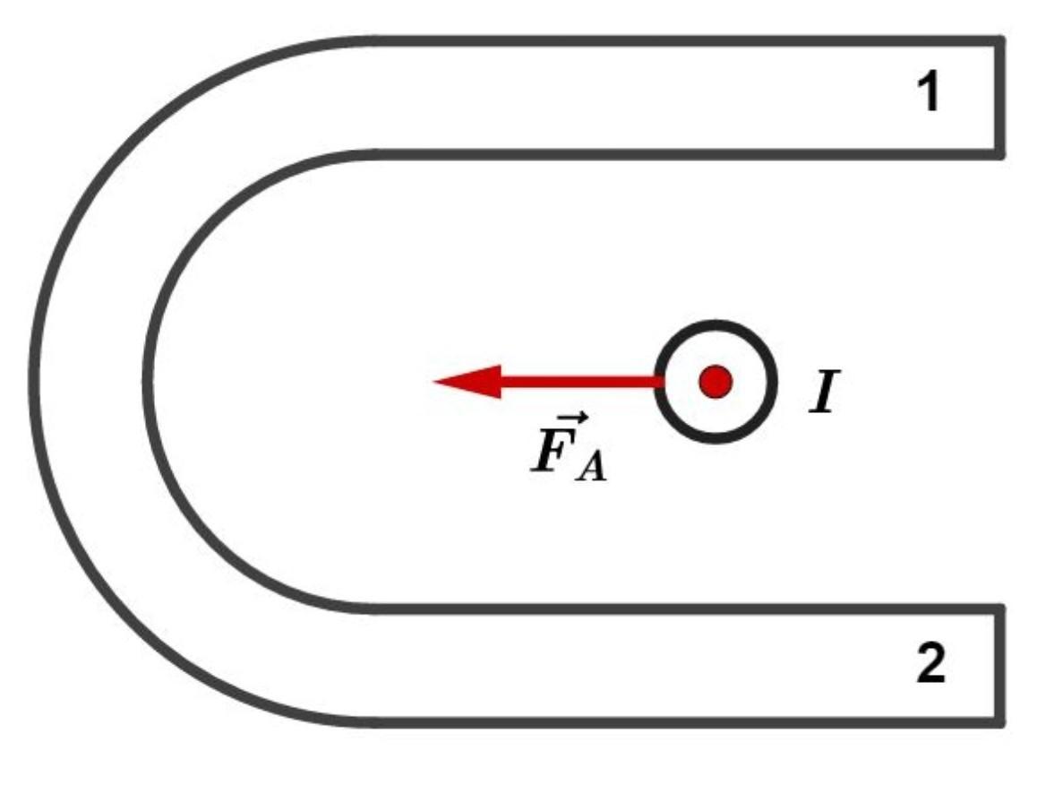 По правилу левой руки. Большой палец располагаем по направлению вектора силы . Четыре пальца левой руки смотрят на нас перпендикулярно картинке. Так как сила тока I Направлена перпендикулярна плоскости картинки на нас. Это выражается точкой внутри кружка около буквы I. Теперь магнитное поле входит в ладонь и выходит с тыльной стороны ладони. То есть со стороны 2 к 1. Как известно, линии магнитного поля выходят из северного полюса и входят в южный полюс. Значит северным полюсом будет 2 (оттуда выходят линии магнитного поля), а южным полюсом будет 1 (туда входят линии магнитного поля).