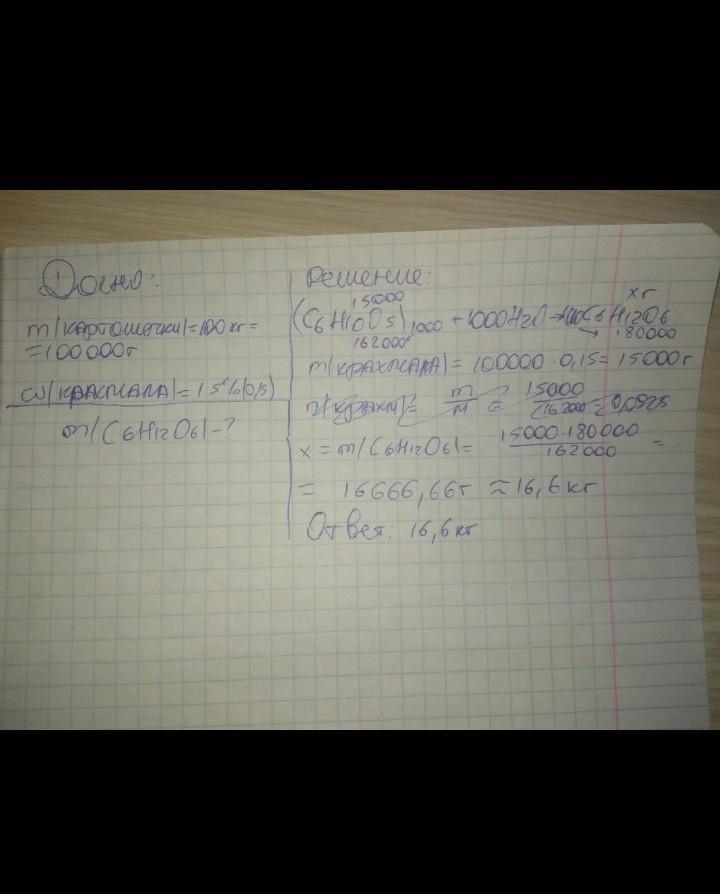 Вычислите массу глюкозы, можно получить в результате гидролиза картофельного крахмала, выделенного из 100 кг картофеля, если известно, что в клубнях картофеля 15% крахмала, а уравнением гидролиза являются: (с6h10o5)1000 + 1000h2o = 1000c6h12o6
