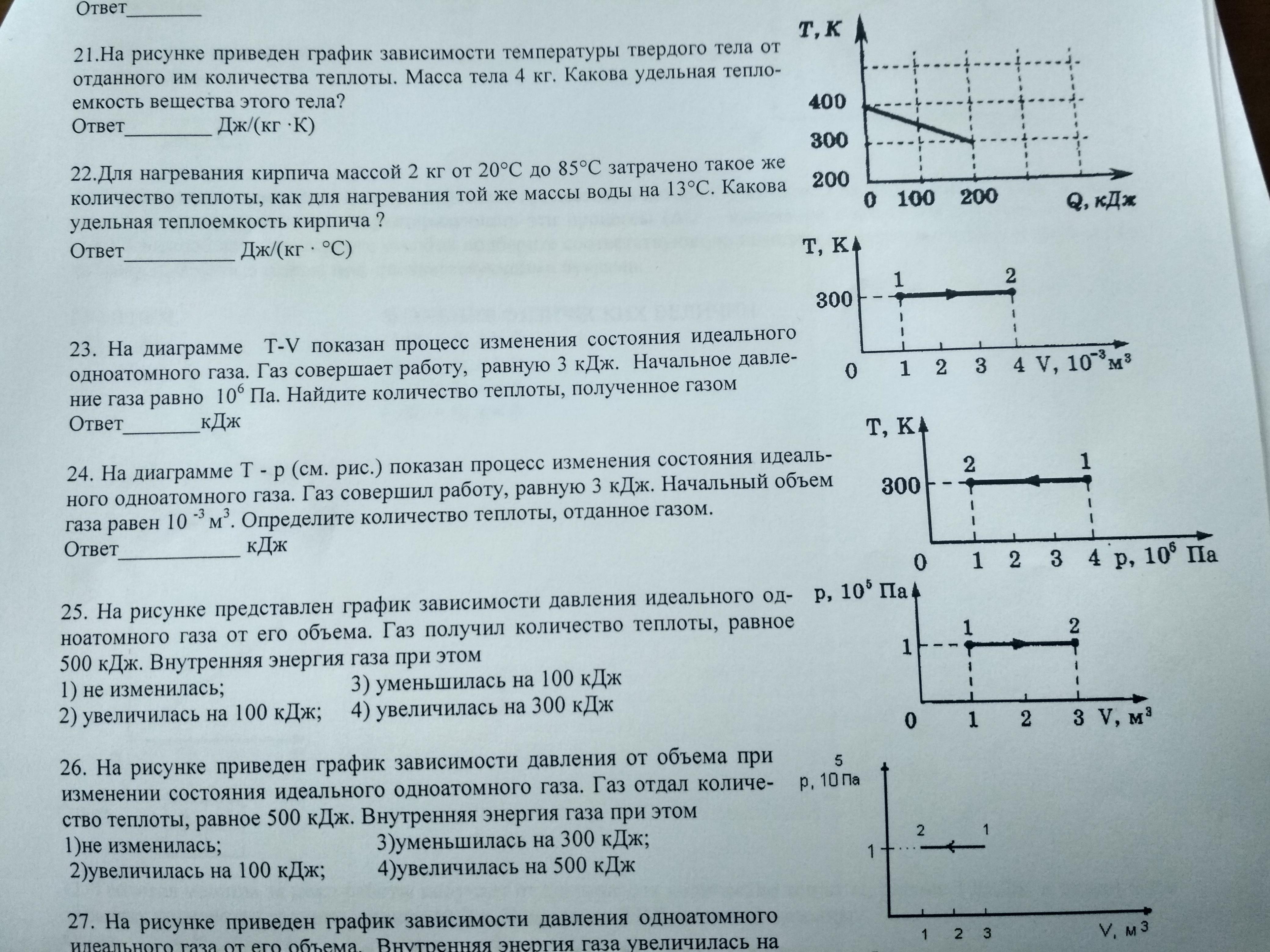 24) A=3 кДж Процесс изотермический Q= - A= - 3 кДж (минус - охлаждается)