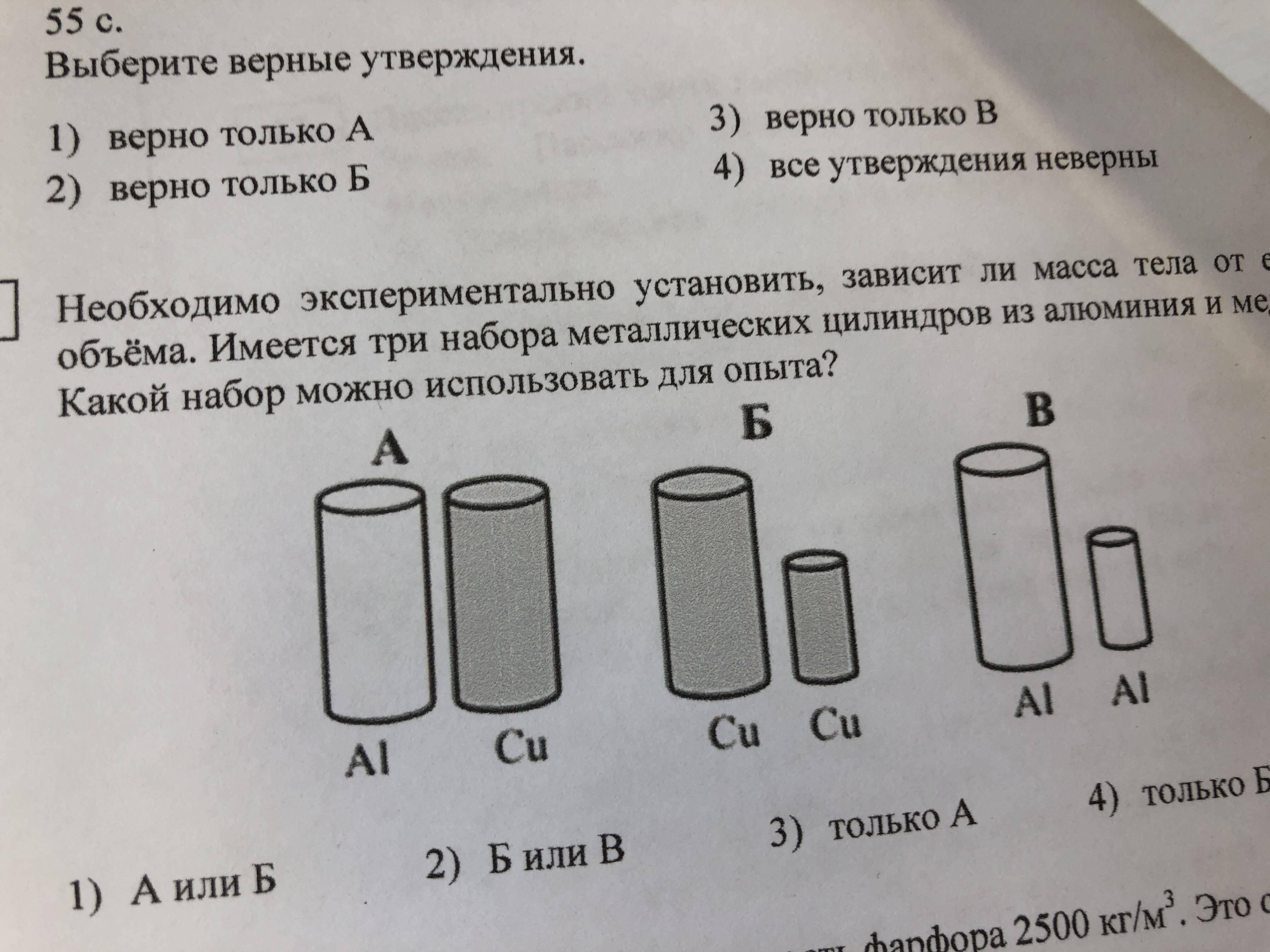 Необходимо экперементально установить зависит ли масса тела от его объёма . Имеется три набора металлический цилиндров из алюминия и меди . Какой набор можно использовать для опыта ?