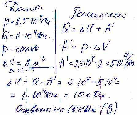 Газ находился под давлением 5000 Па. При сообщении газу 5 к Дж те плоты он расширился и объем увеличился на 1 м^3. На сколько изменилась внутренняя энергия?