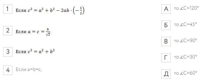 В треугольнике ABC: AB=c, BC=a, AC=b. К каждому началу предложения (1-4) подберите его окончание (А-Д) так, чтобы получилось правильное утверждение.