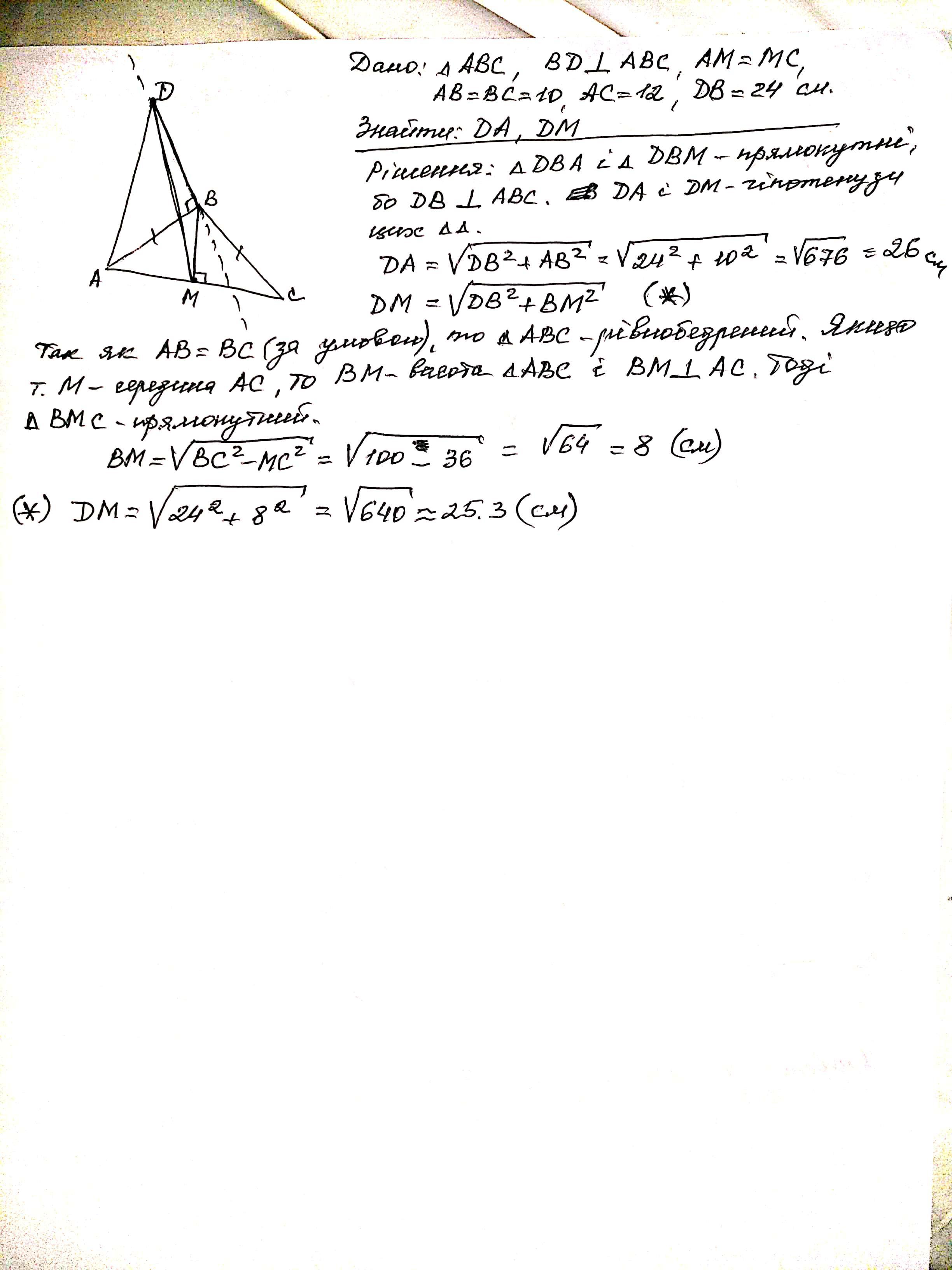 Через вершину В трикутника АВС проведено пряму ВD перпендикулярну до площини АВС .Точка М-середина відрізка АС .Знайдіть відрізоки DA і DM якщо АВ=ВС=10 см АС=12 см DB=24см