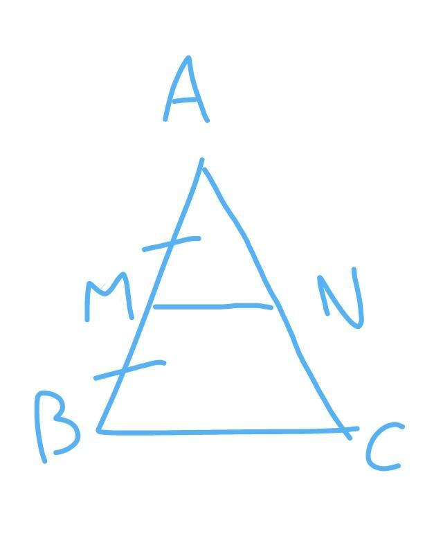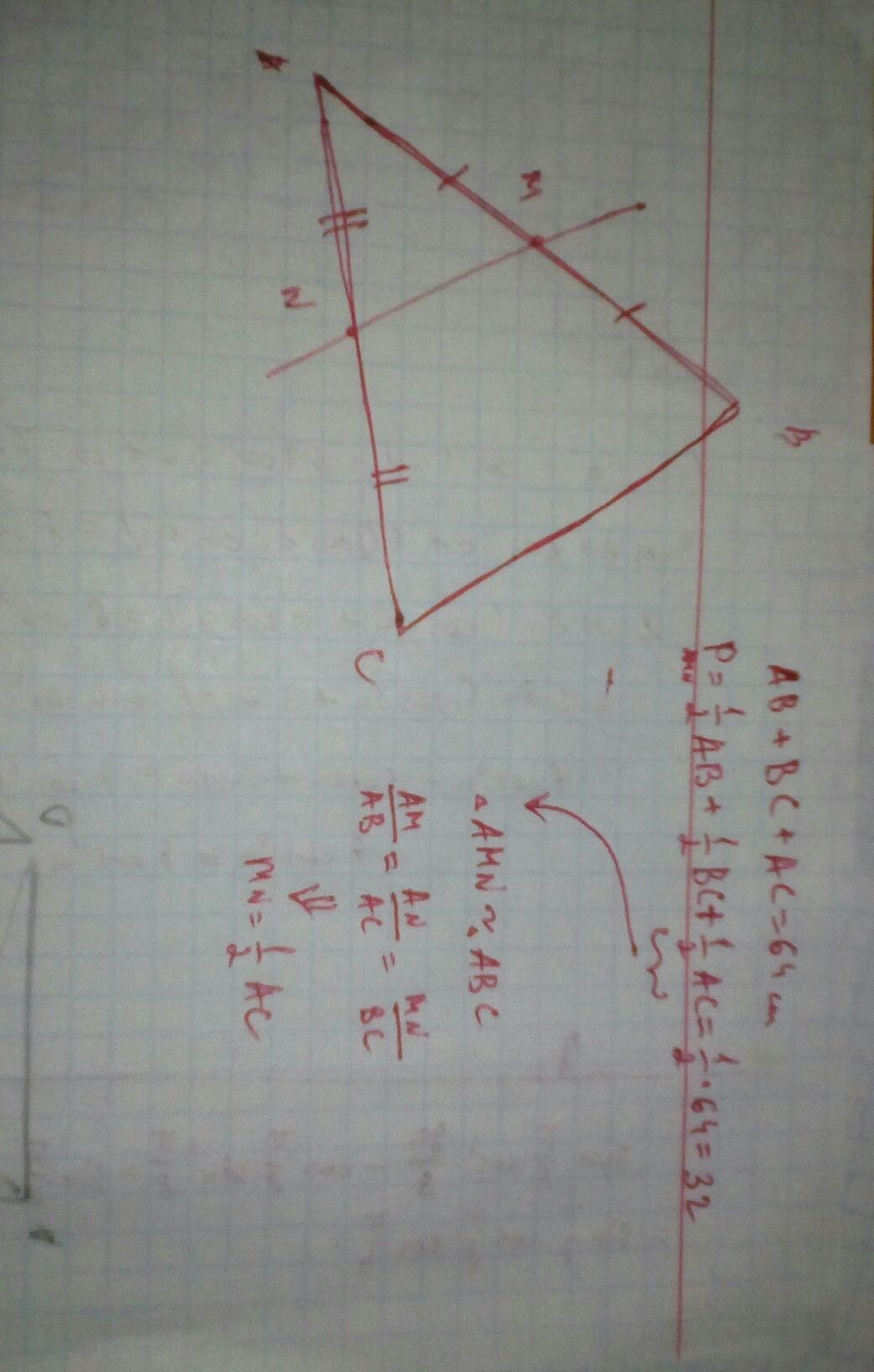 Дан треугольник АВС. В нем МN— часть прямой, параллельной ВС, которая делит сторону АВ пополам ( точка М принадлежит стороне АВ, а точка N стороне АС ). Найдите Периметр АМN, если периметр АВС=64см.