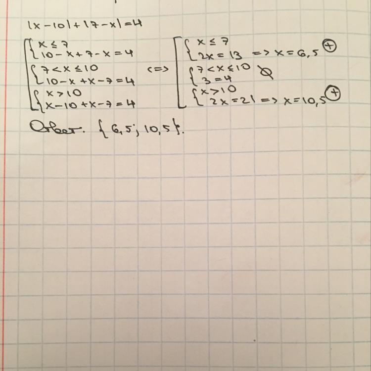 Ответ: перепишем равенство как |x-10|+|7-x|-4=0, для него характерны 3 участка: от -∞ до 7 (функция убывает), от 7 до 10 (функция параллельна оси ОХ и равна -1) и от 10 до +∞ (функция возрастает). На интервале от -∞ до 7 равенство перепишем как 10-х+7-х=4⇒17-2*х=4⇒2*х=13⇒х=6,5. На интервале от 10 до +∞ равенство перепишем как х-10+х-7=4⇒2*х-17=4⇒2*х=21⇒х=10,5.