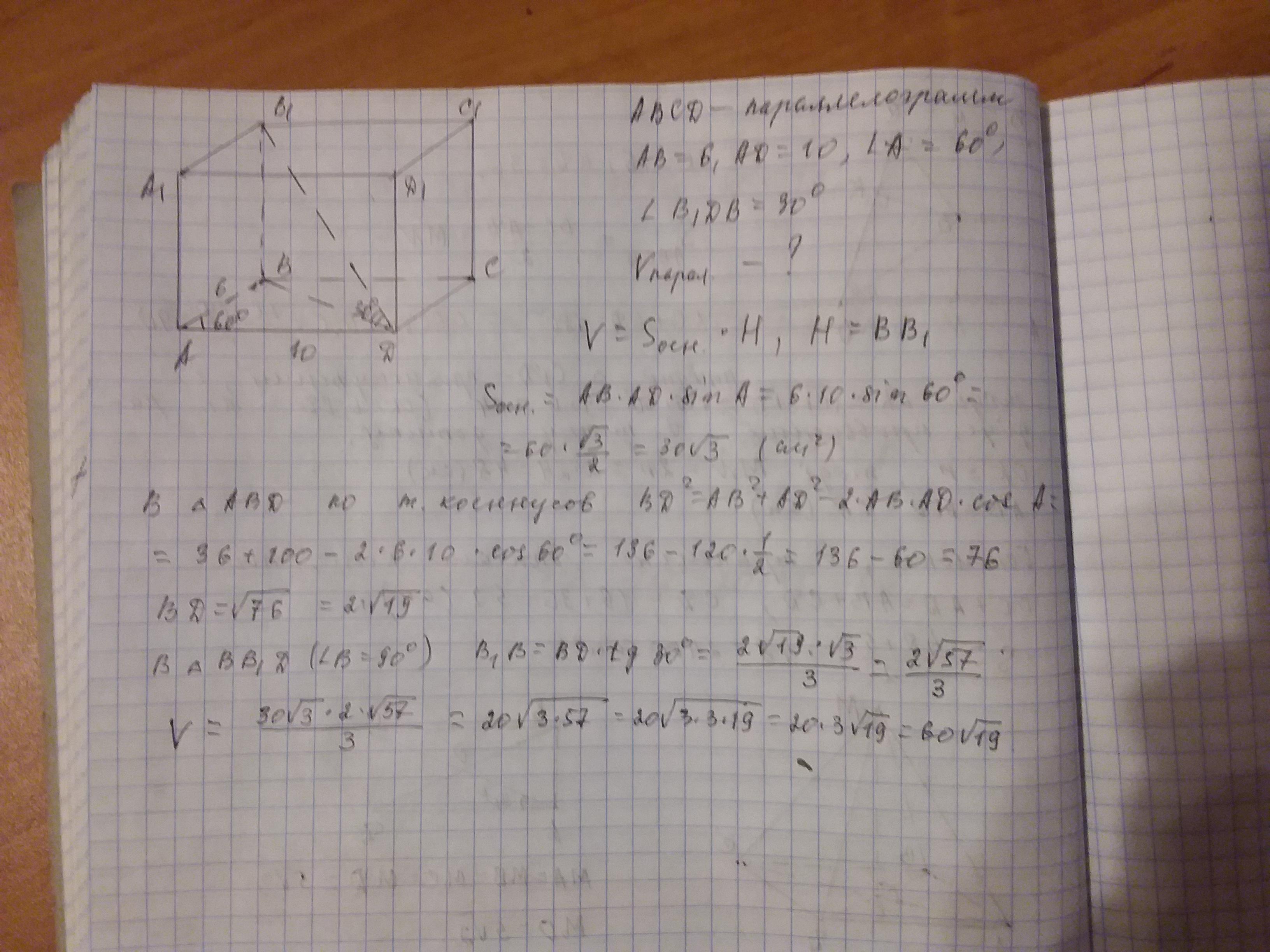 Помогите с геометрией! Стороны основания прямого параллелепипеда равны 6 и 10 см один из углов основания 60 градусов, меньшая диагональ параллелепипеда составляет с плоскостью основания угла 30 градусов. Найдите объём параллелепипеда. Напишите с решением.