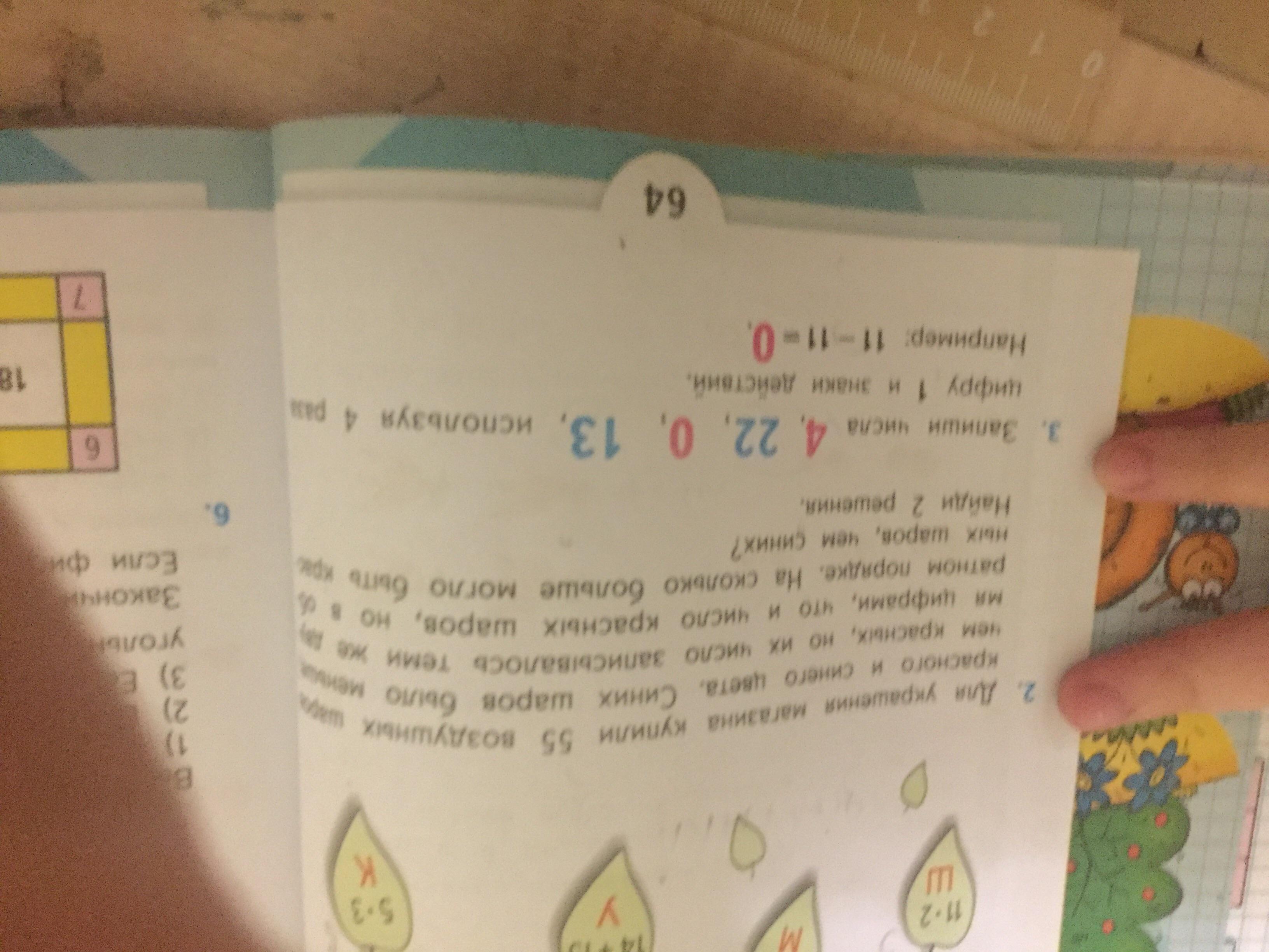 Задачу можно решить способом подбора. Ясно, что число шаров каждого цвета — двузначное. Перебираем числа, в которых 1 десяток. Проверяем: 10, 11, 12 и 13 не подхо-дят. Подходят числа 14 и 41. Остальные числа, в которых 1 десяток, тоже не подходят. Значит, первый вариант ре-шения такой: синих шаров 14, а красных 41. Проверяем числа, в которых 2 десятка. Числа 20, 21 и 22 не подходят.